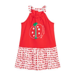 Red and white dress for girls by Agatha Ruiz de la Prada, made in soft cotton jersey. The bodice has a fun red, green and white appliqué on the front, with white logo embroidery. The skirt has a red heart pattern, with matching trim on the neckline. The dress fastens with buttons on the back.