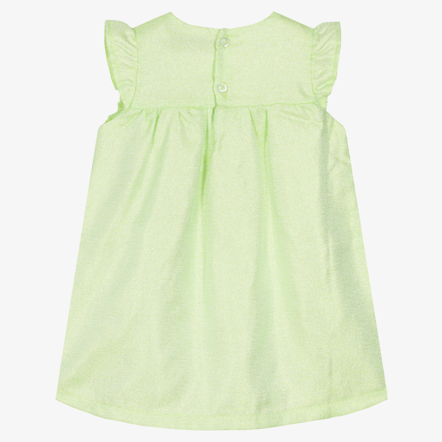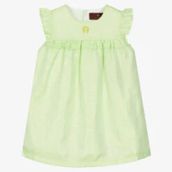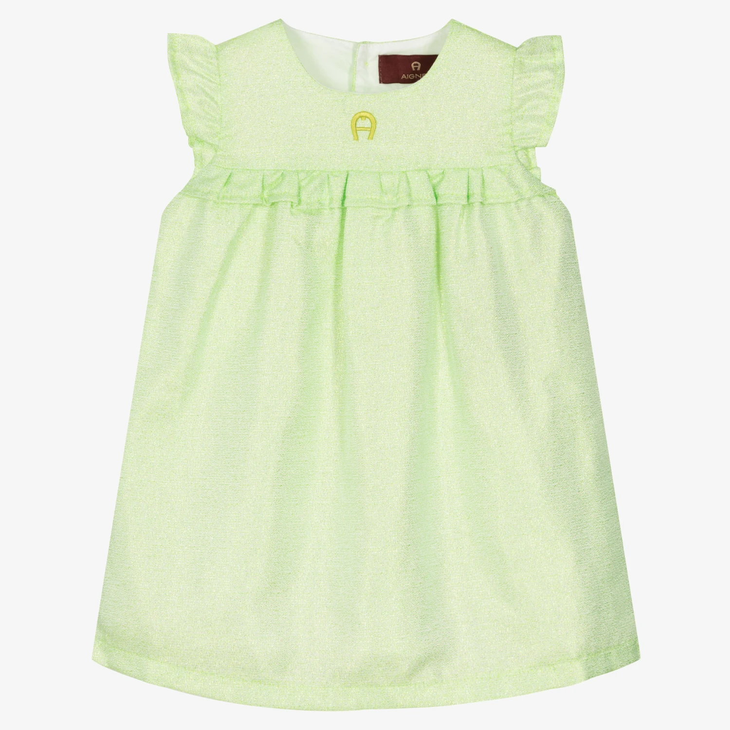 Lovely for a special occasion, a glittery green dress for little girls from AIGNER. Woven with a sparkly thread, this sweet sleeveless style has ruffle trim on the bodice and is embroidered on the front with the brand’s signature ‘A’ horseshoe logo. It is comfortably lined in lightweight cotton and fastens with branded buttons on the back.
