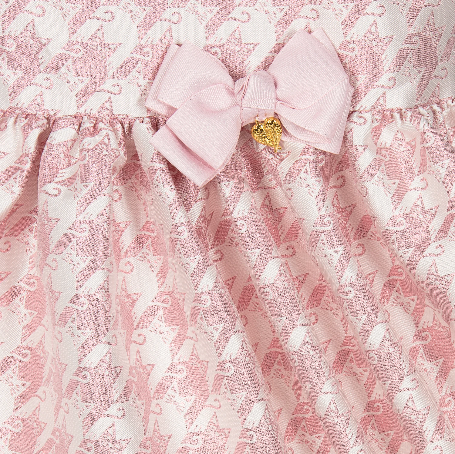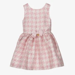 Gorgeous glittery pink and white special occasion dress for girls by Angel’s Face, woven in a quirky cat houndstooth pattern. A classic design, this sleeveless style has a large pink grosgrain bow on the waistline with the signature gold heart logo charm. Fully lined in silky crêpe fabric, the dress fastens of the back with an exposed gold zip that has a matching heart charm pull.