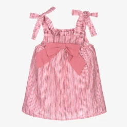 Pink and white striped dress for girls by luxury Italian brand Babidu, with a dark pink bow on the front. Made in comfortable cotton, it has frills across the top of the bodice, with fixed bows on the shoulder straps. It is gently elasticated under the arms.