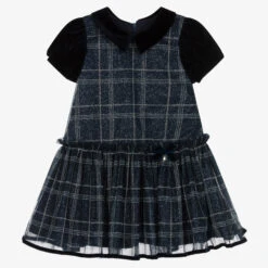 A navy blue check dress for girls by Balloon Chic, made from glittery delicate tulle. Lovely for special occasions, this dress has a velvet collar, puff sleeves, and a bow with a silver heart charm. There is a zip fastening on the back and a soft cotton voile lining.