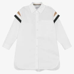 White cotton shirt dress for girls by BOSS, made in crisp, lightweight poplin. Simple and stylish, it has branded button fastenings and an embroidered logo on the chest pocket. For a unique look, the dress has signature striped trim on the shoulders in beige, white and black, a shaped hem that is slightly longer at the back, and gathers on the back for a relaxed fit.