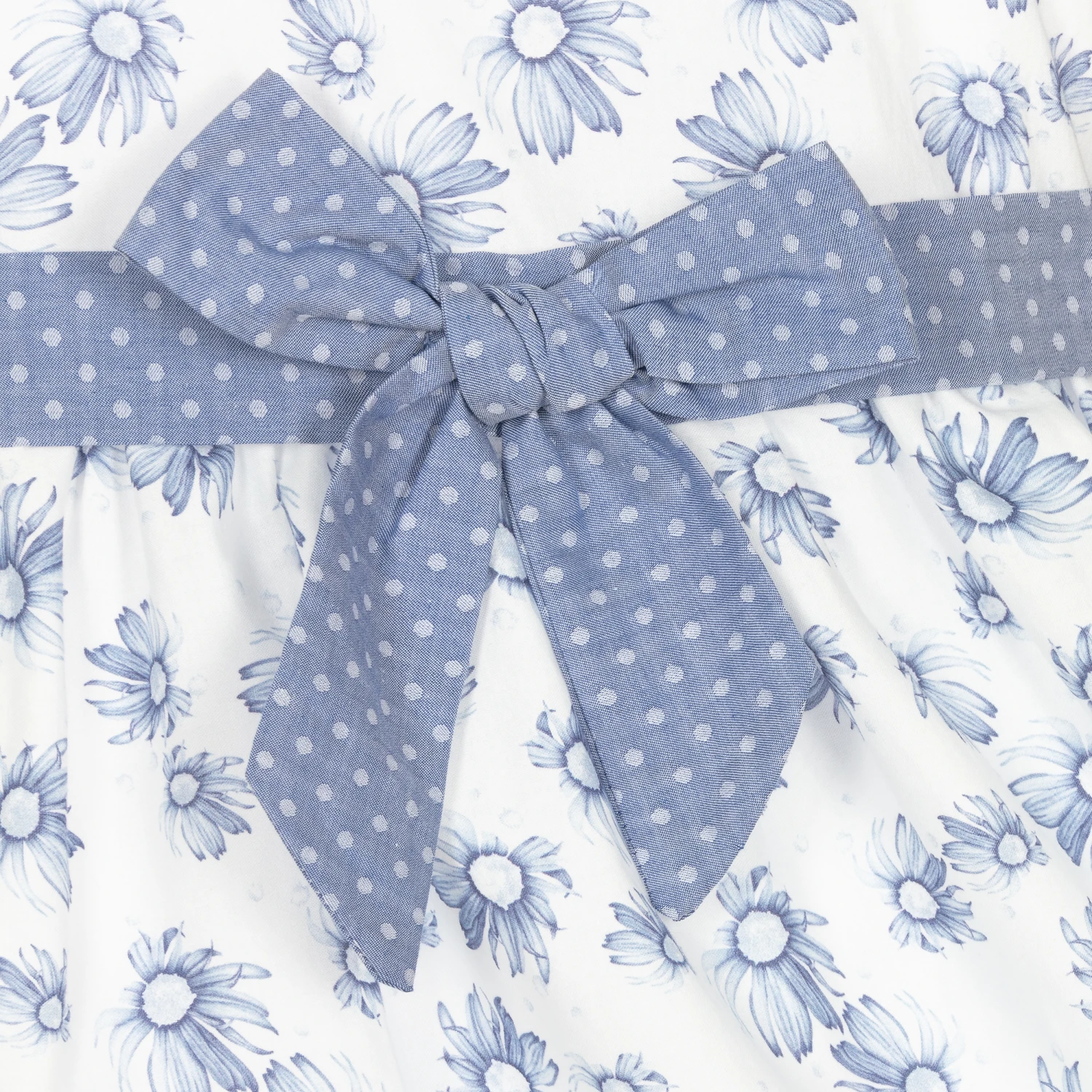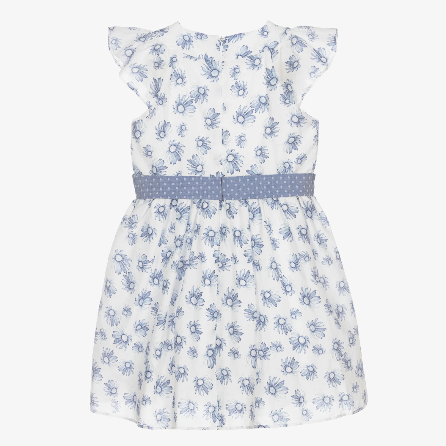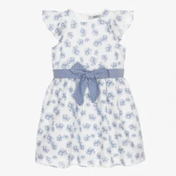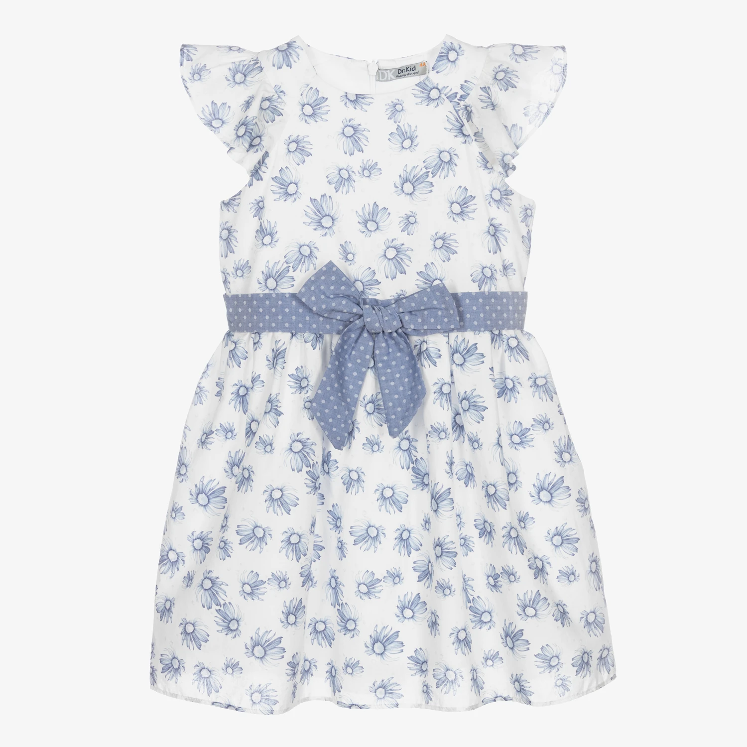A pretty white and blue daisy print dress for girls by Dr. Kid. Made in lightweight cotton, it has capped flutter sleeves and a fixed dot-patterned bow belt around the waist. Lined in lightweight cotton, it fastens with a concealed zip on the back.
