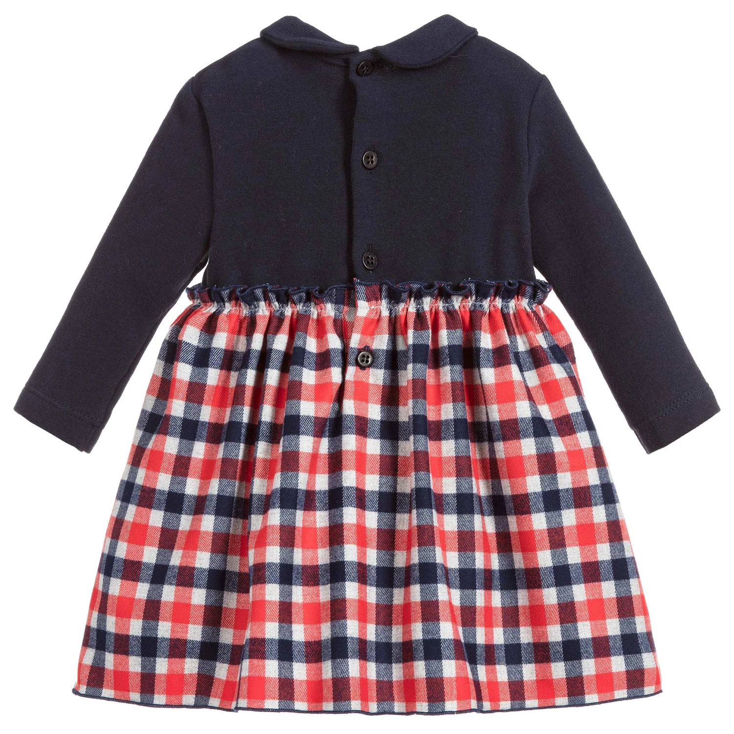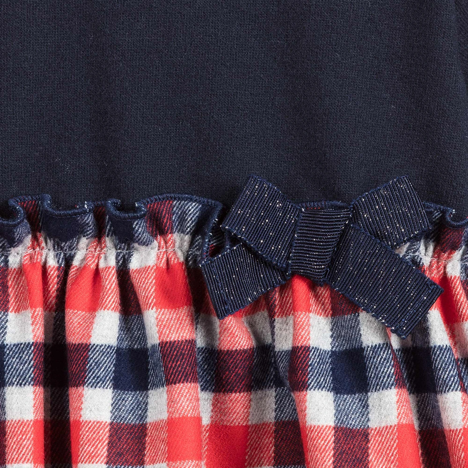 Soft and comfortable dress for little girls by Il Gufo. The navy blue bodice is made in stretchy jersey, while the red and blue check skirt is made in a lightweight viscose blend cloth.