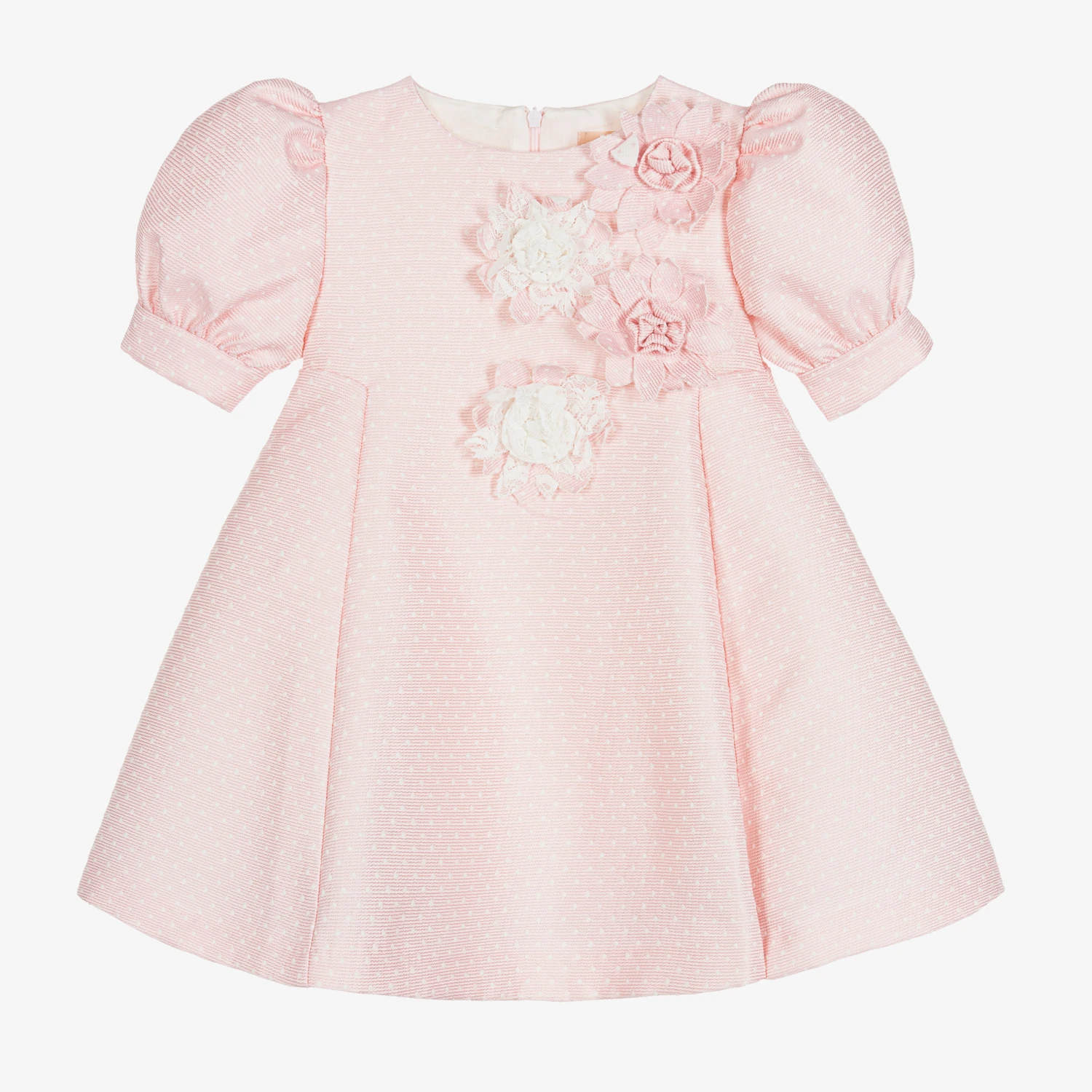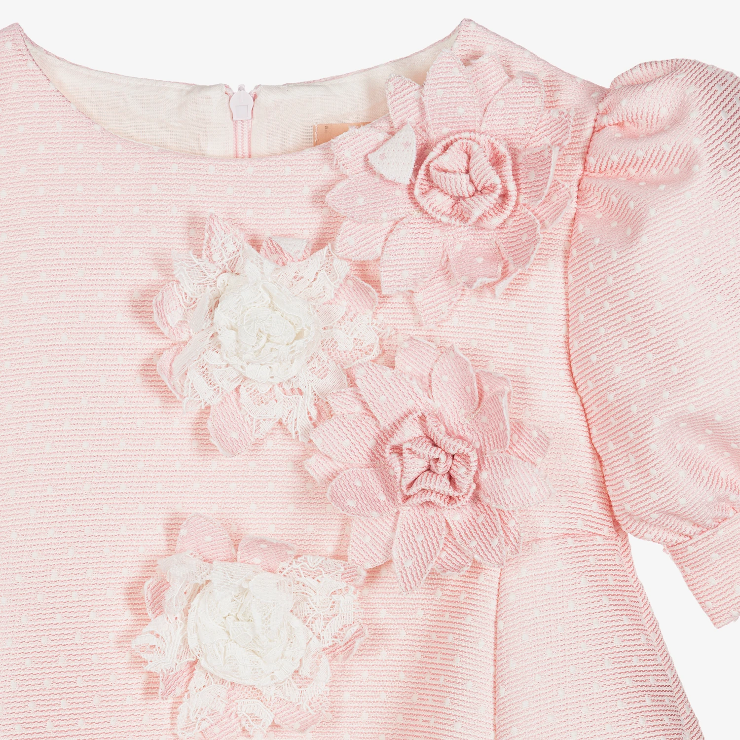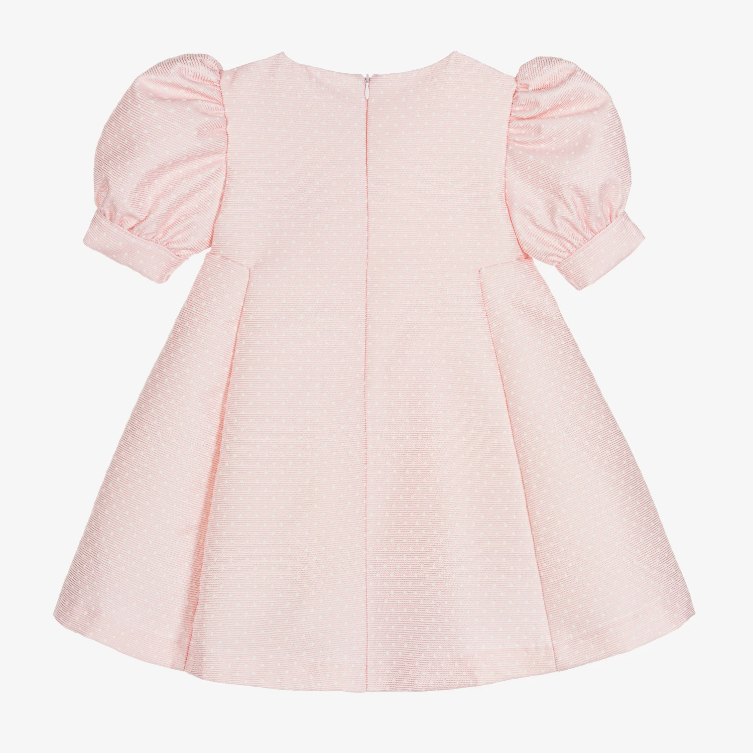 A light pink dress for girls by Irpa, woven in luxuriously soft jacquard. This dress features a miniature polka dot pattern, with delightful appliqué flowers on the bodice. Fitted at the waist in an A-line silhouette, it has pretty puff sleeves and a voluminous tulle underlayer for definition. There is a concealed zip fastening at the back, and a soft cotton lining.