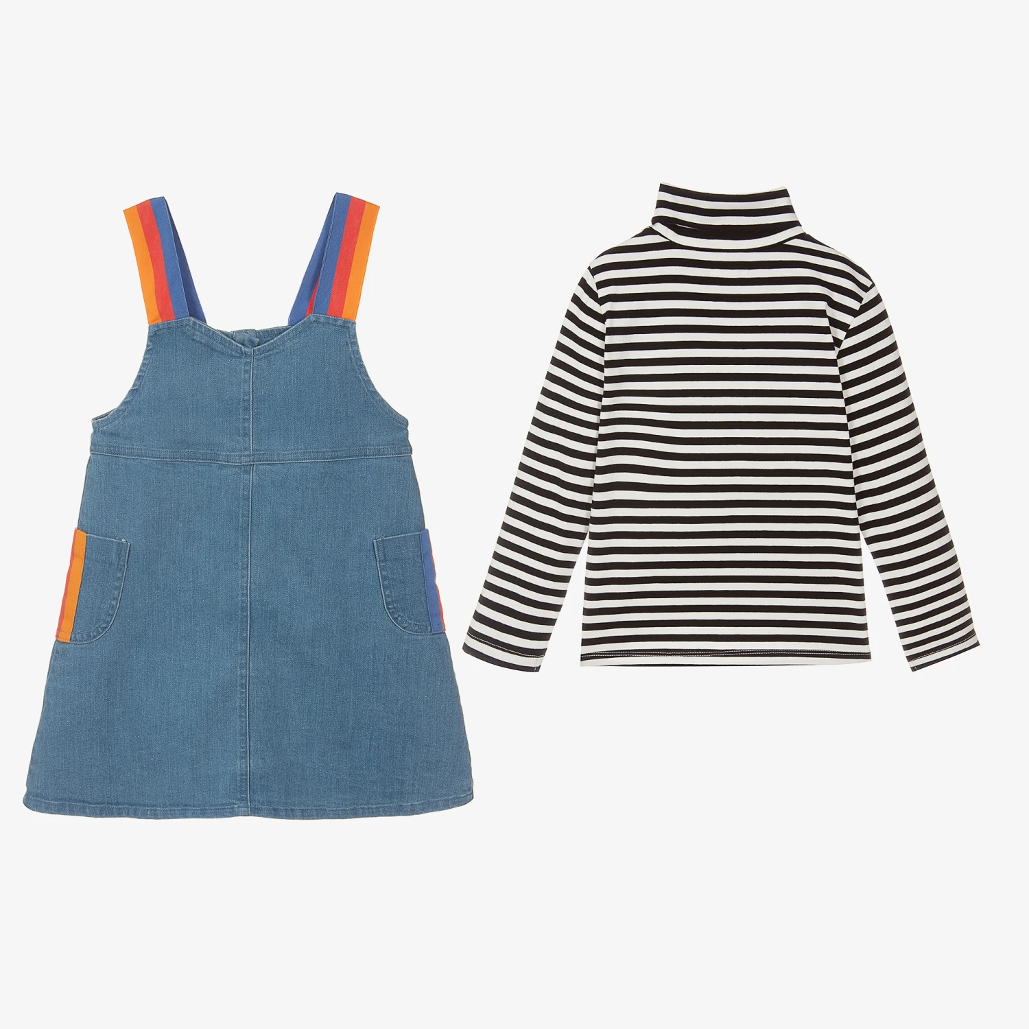 Exclusive to Childrensalon, a cotton denim dress set by Joyday, just right for casual days. The comfortable, stretchy, cotton jersey polo neck top has navy blue and white Breton stripes. The washed-look denim dress has grosgrain shoulder straps with matching trims on the front pockets, striped in blue, red and orange. It fastens with colourful buttons on the front.