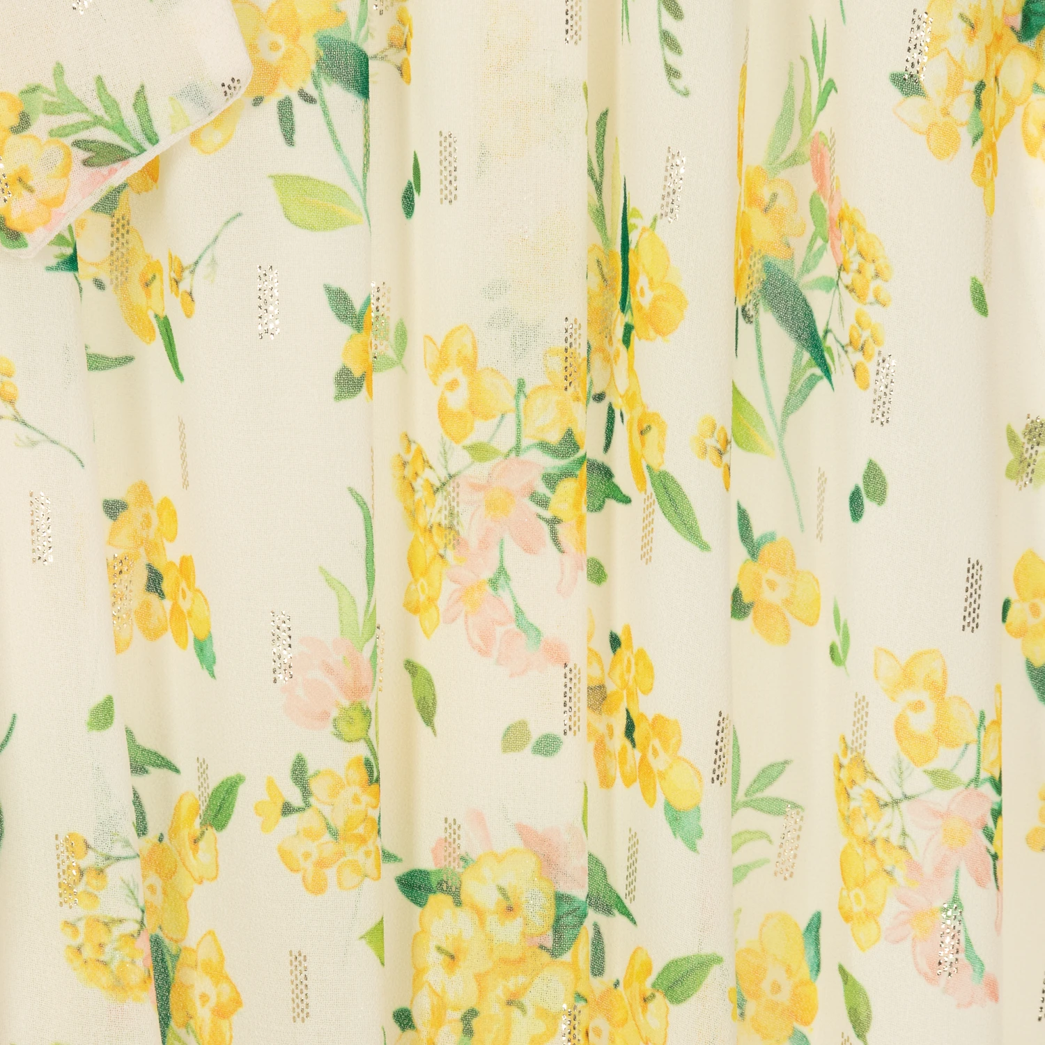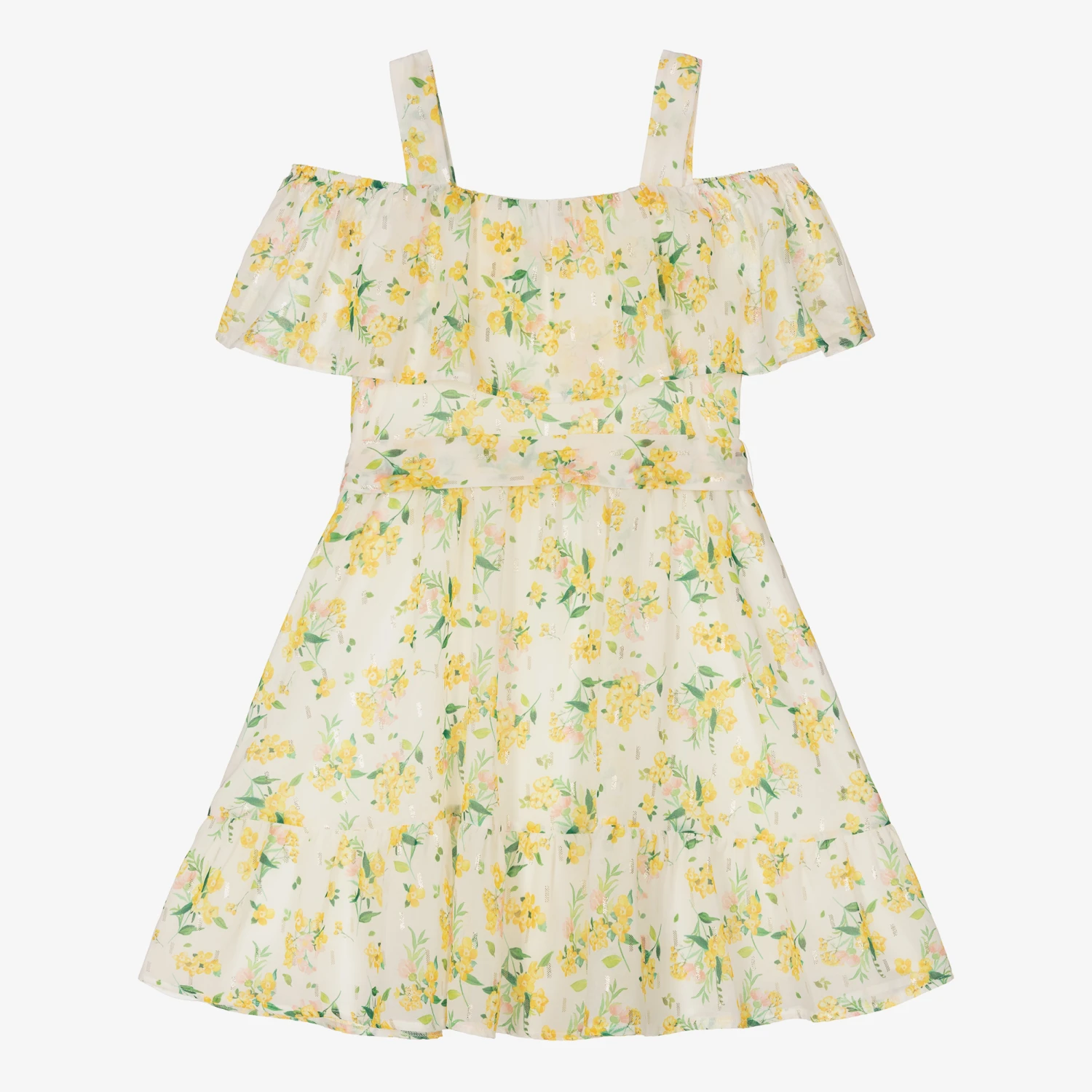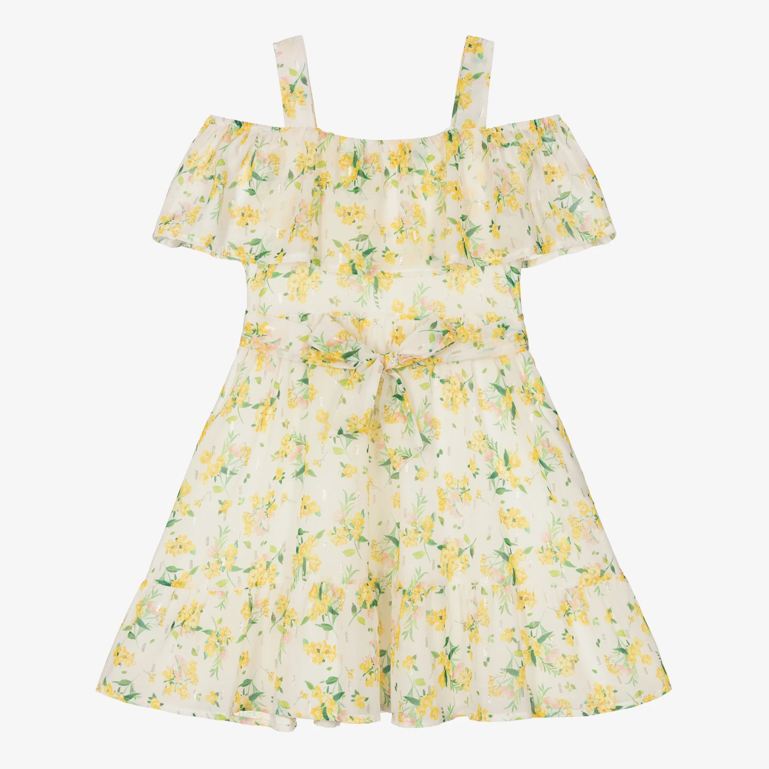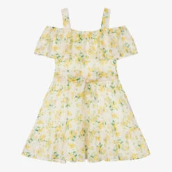 Ivory cold-shoulder dress for girls by Mayoral, made in soft and lightweight chiffon. It is patterned in a beautiful yellow floral print combined with green leaves and a metallic gold pattern for added sparkle. There is a ruffled layer across the bodice and a fixed belt on the waist to tie into a bow at the front. It is fully lined with a ruffled hem for greater volume.