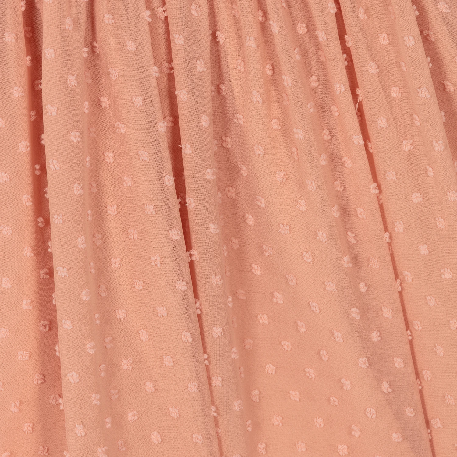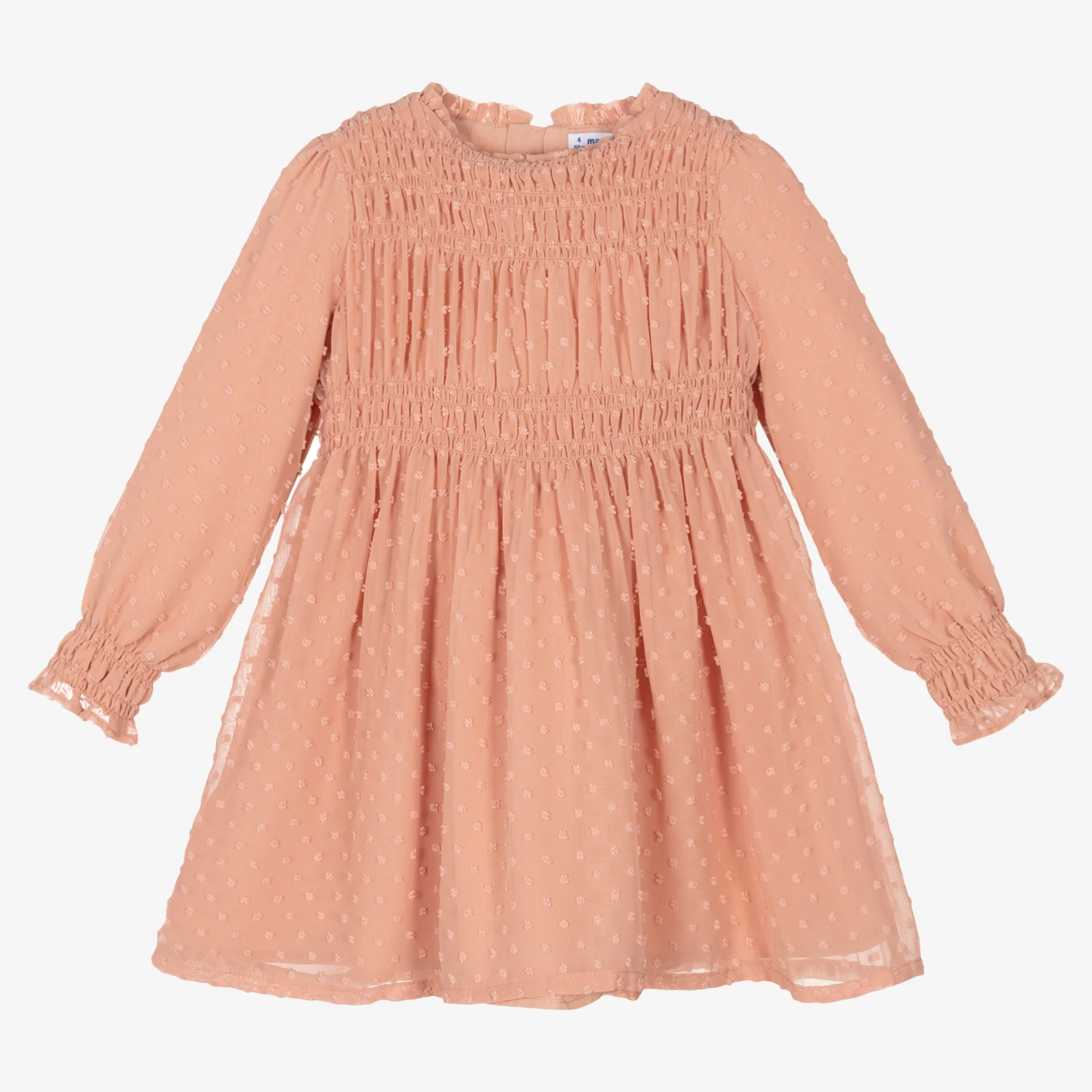 Dusty pink dress for girls by Mayoral, made in soft plumeti chiffon. The bodice is decorated with shirring and has a concealed back zip fastening. It has a soft viscose voile lining and elasticated sleeve cuffs.