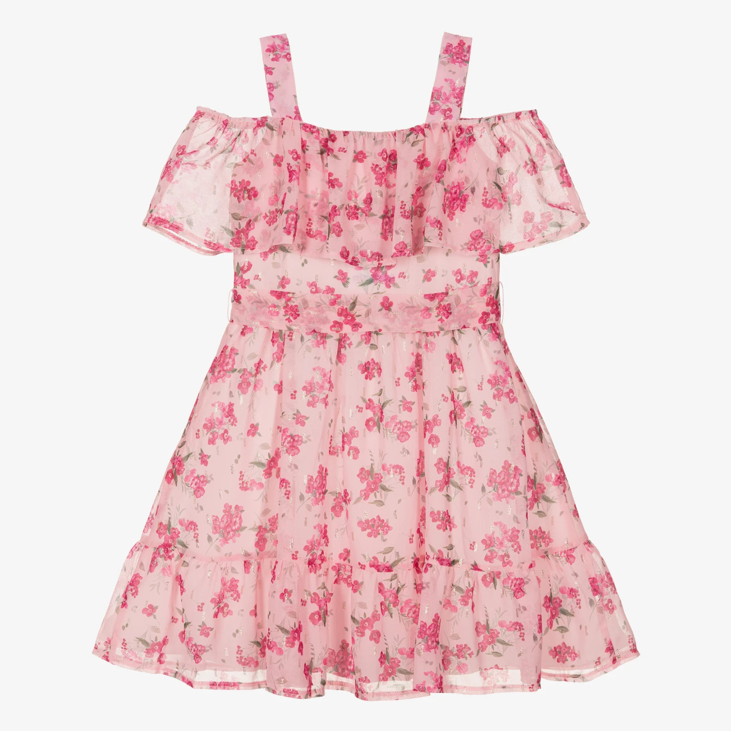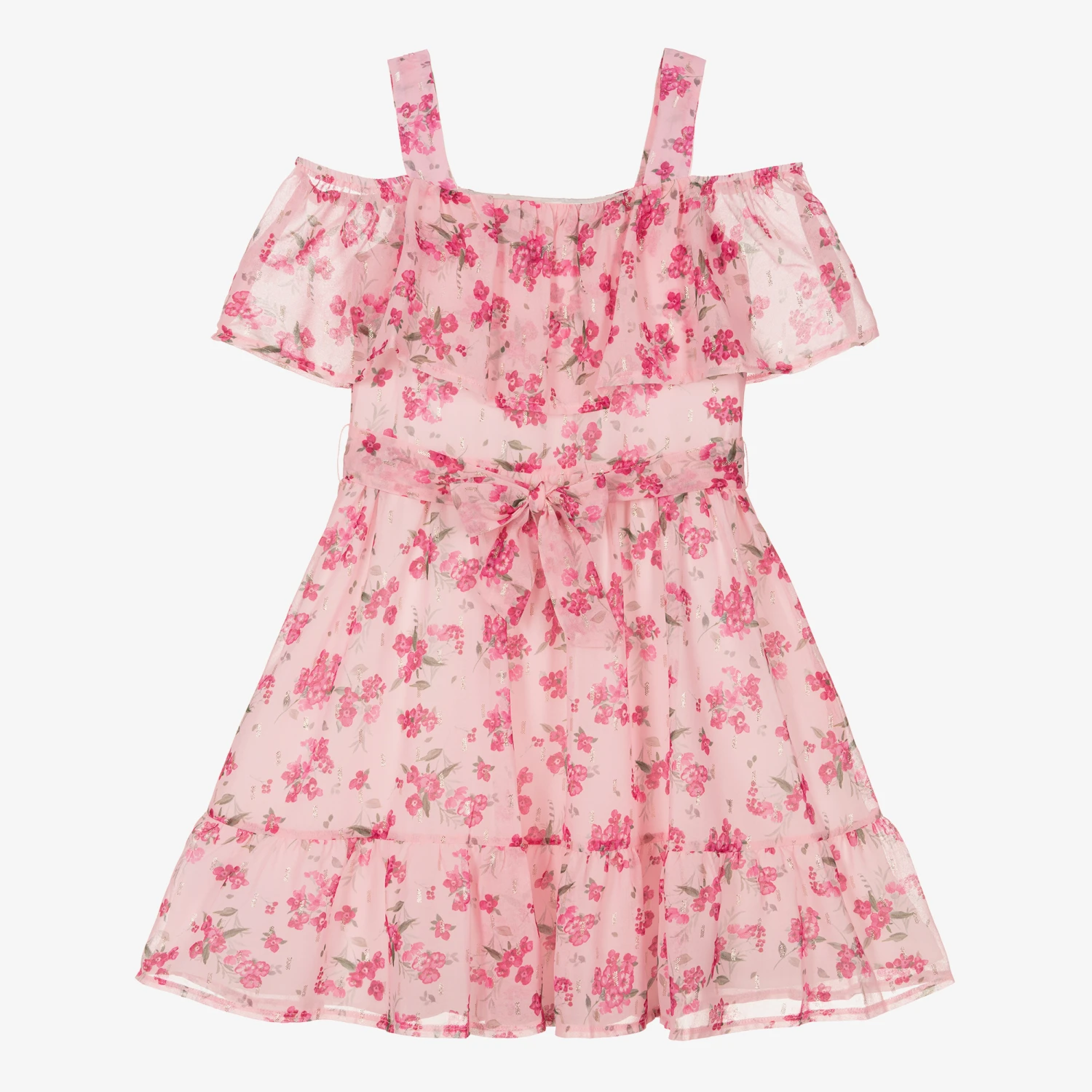Light pink cold-shoulder dress for girls by Mayoral, made in soft and lightweight chiffon. It is patterned in a beautiful fuchsia pink floral print combined with green leaves and a metallic gold pattern for added sparkle. There is a ruffled layer across the bodice and a fixed belt on the waist to tie into a bow at the front. It is fully lined with a ruffled hem for greater volume.