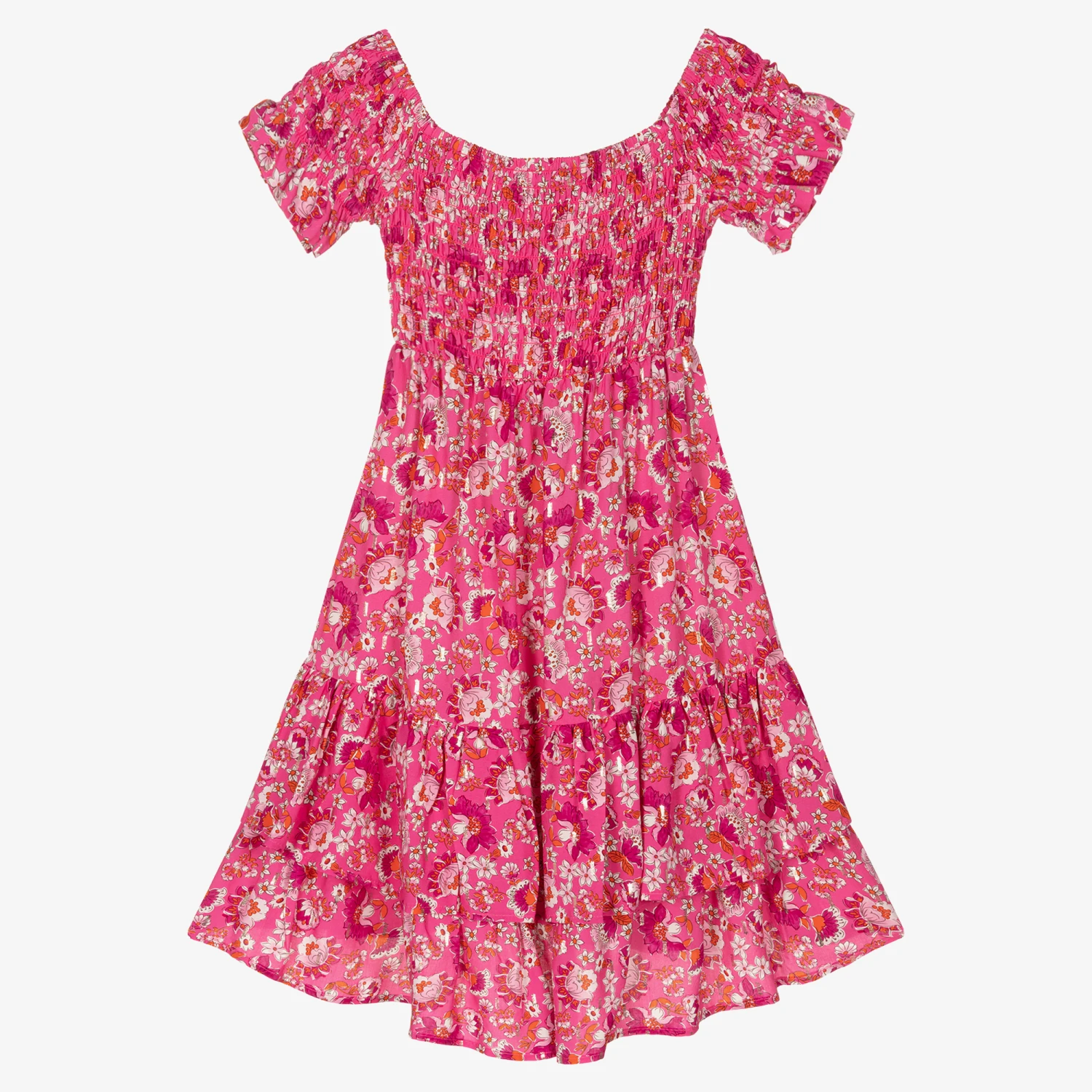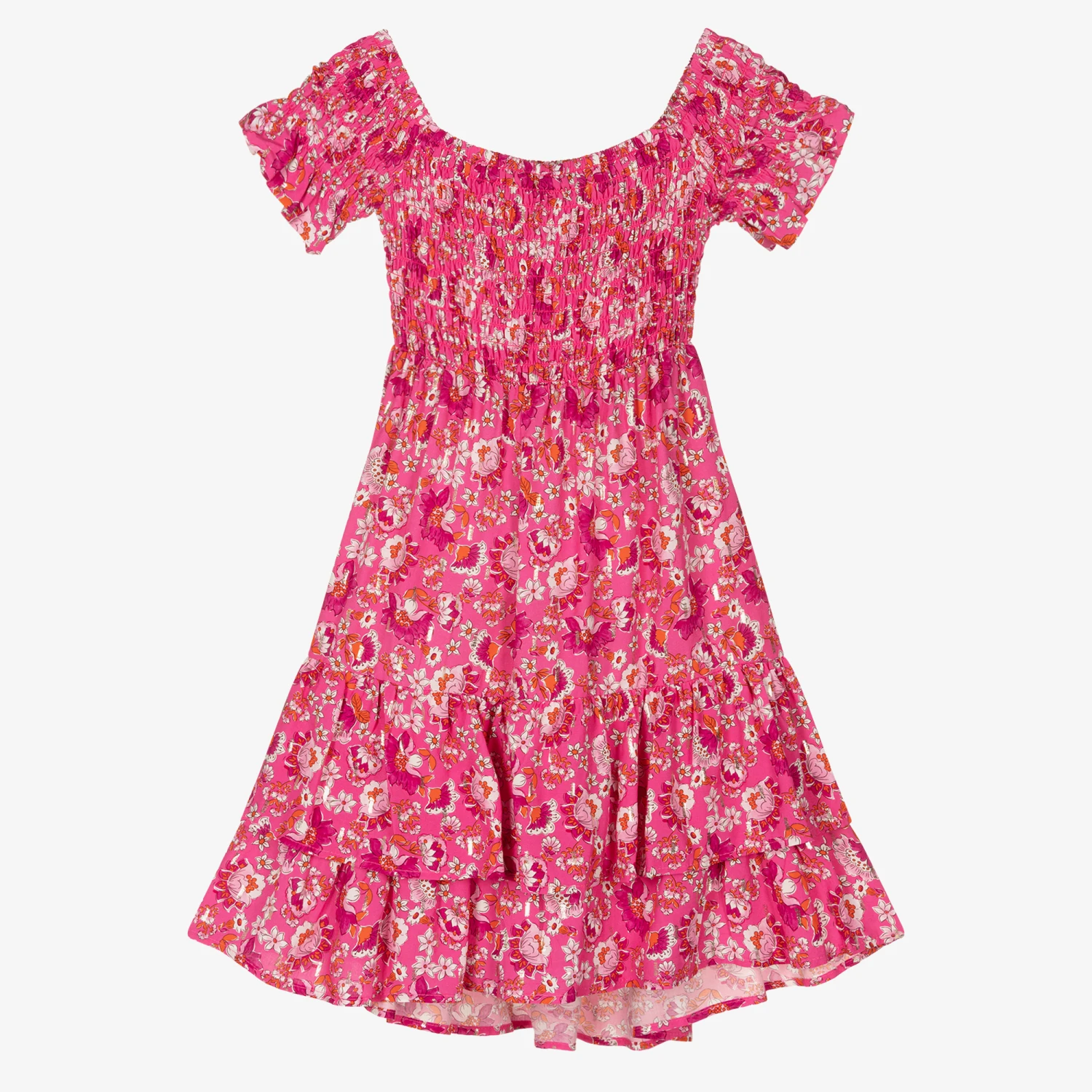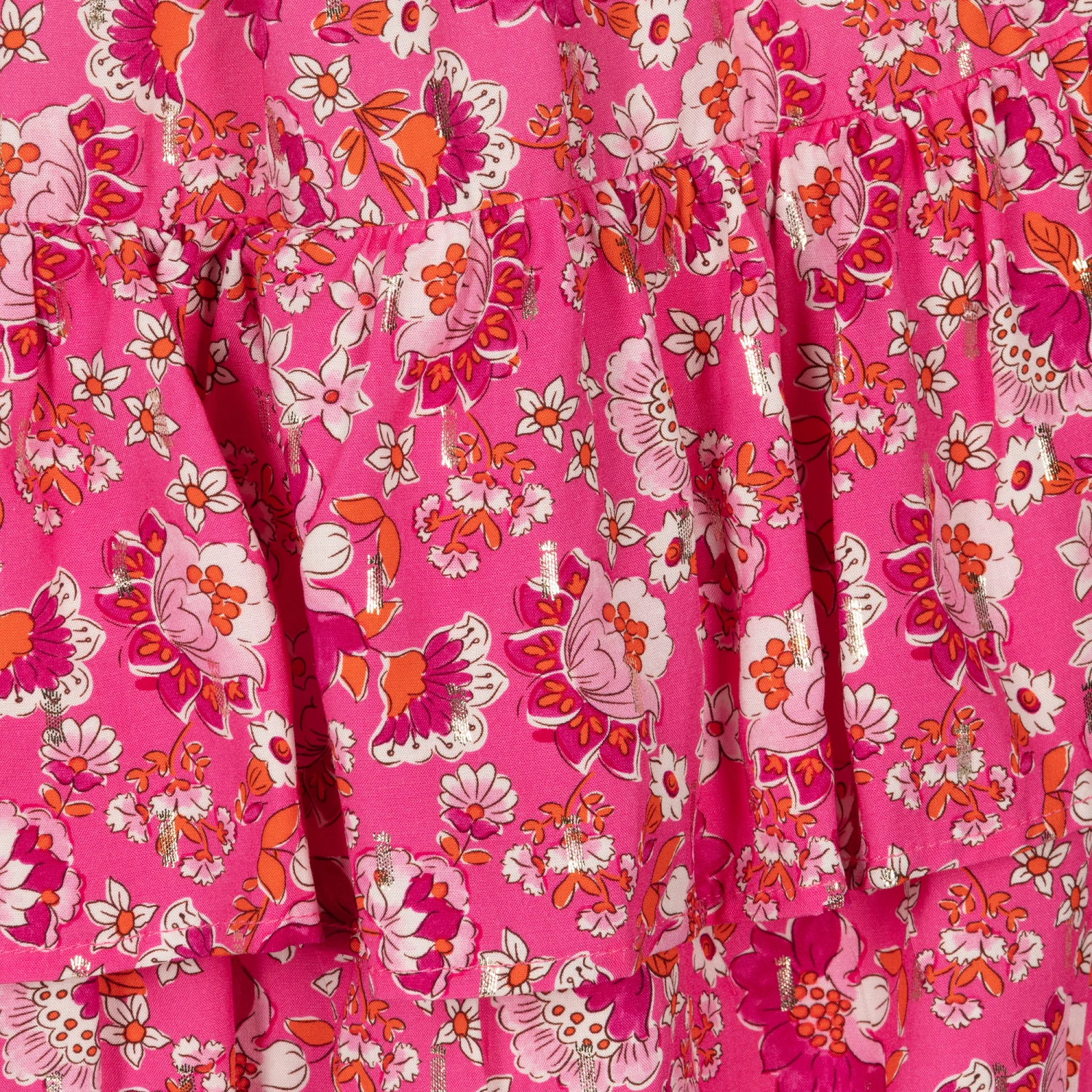 Beautiful pink floral dress for girls by Mayoral, with shiny gold print for a touch of sparkle. Made in soft and lightweight viscose, this comfortable style is shirred on the bodice and sleeves and can be worn off the shoulder. It has a dipped back hem with tiered ruffles to complete the look. Easy-to-wear, the dress simply slips over the head.