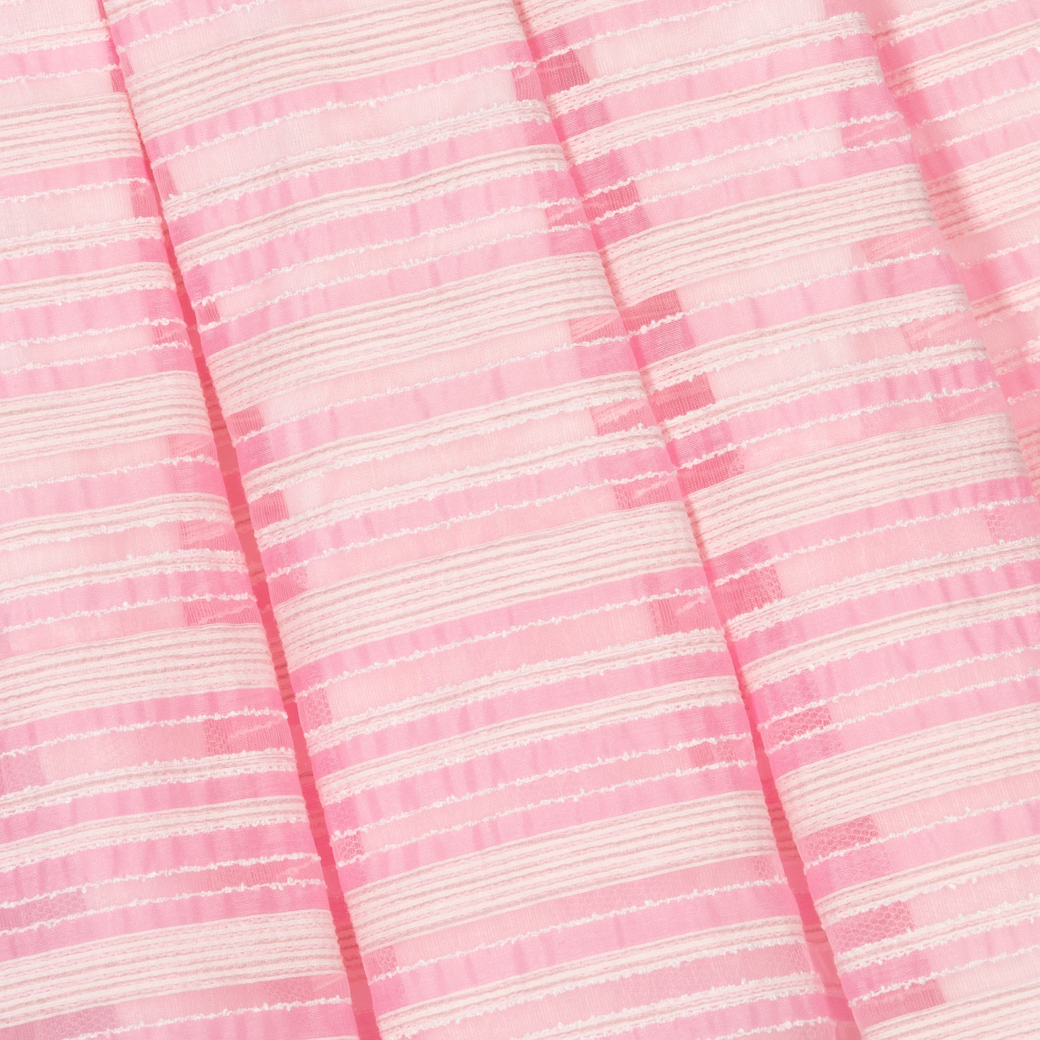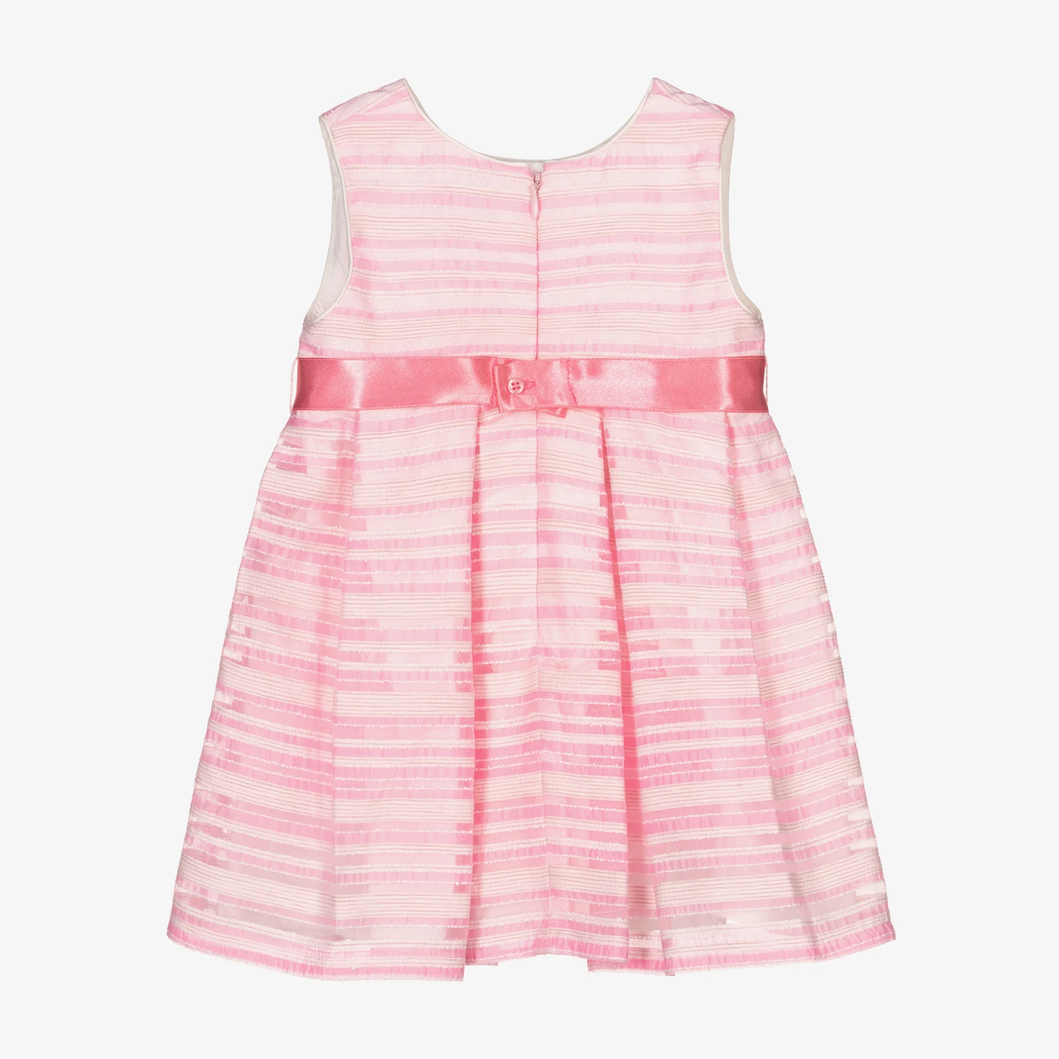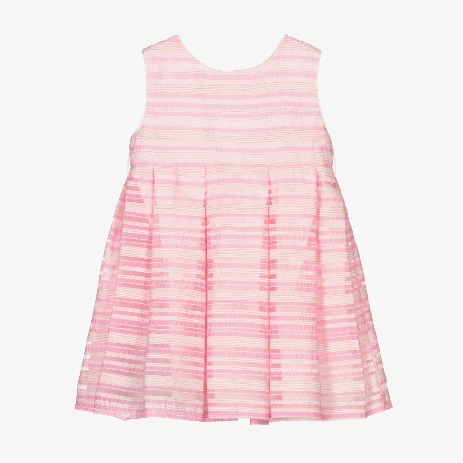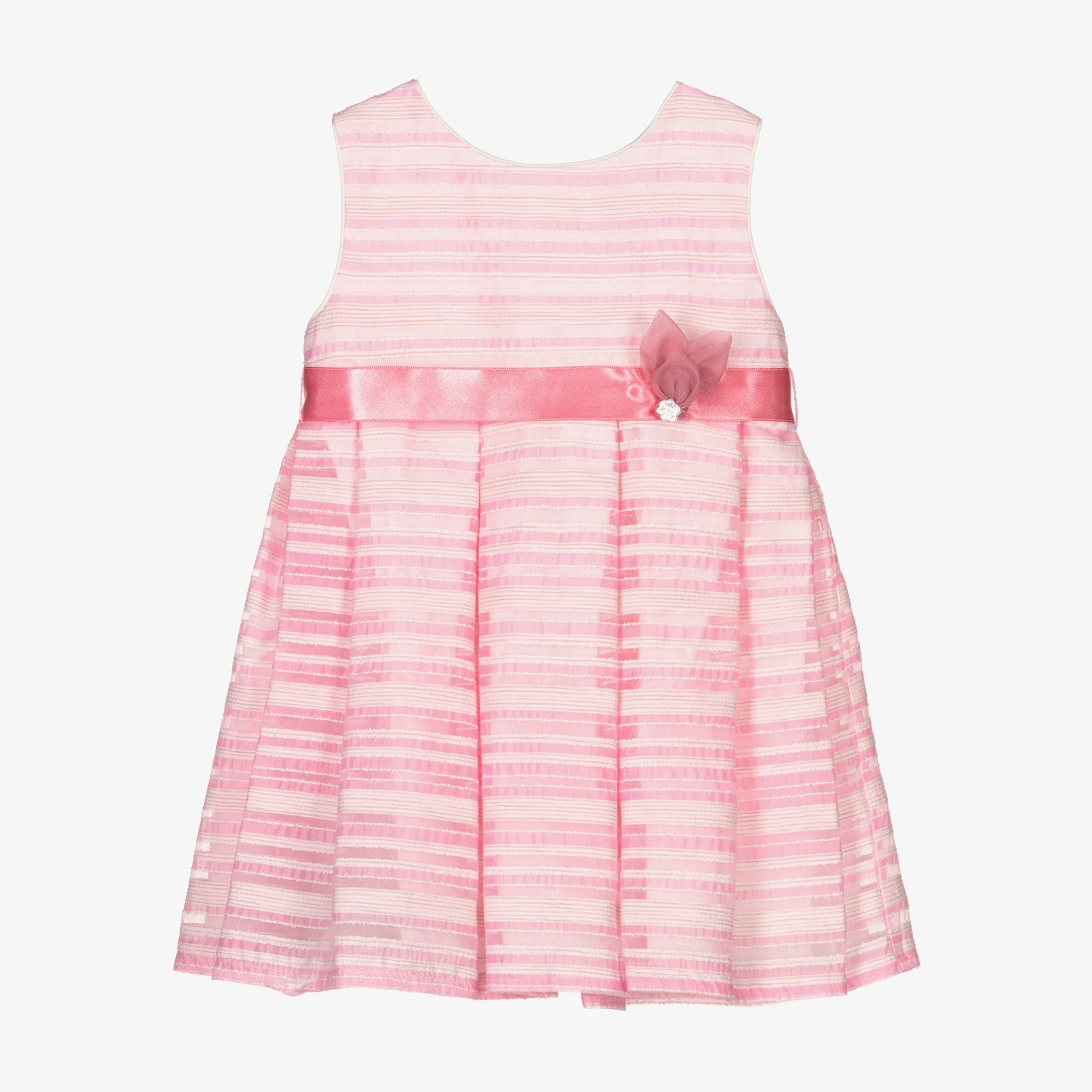 A sleeveless special occasion dress for little girls by Mayoral. Made in a sheer pink organza, it has fine white threads and a pink striped pattern. The pink ribbon belt has organza leaves, with a silver metal flower detail. Fully lined for comfort, it has a gathered skirt and layers of cotton and tulle for a pretty silhouette.