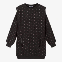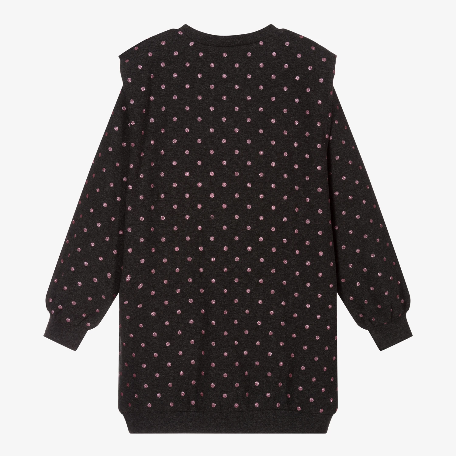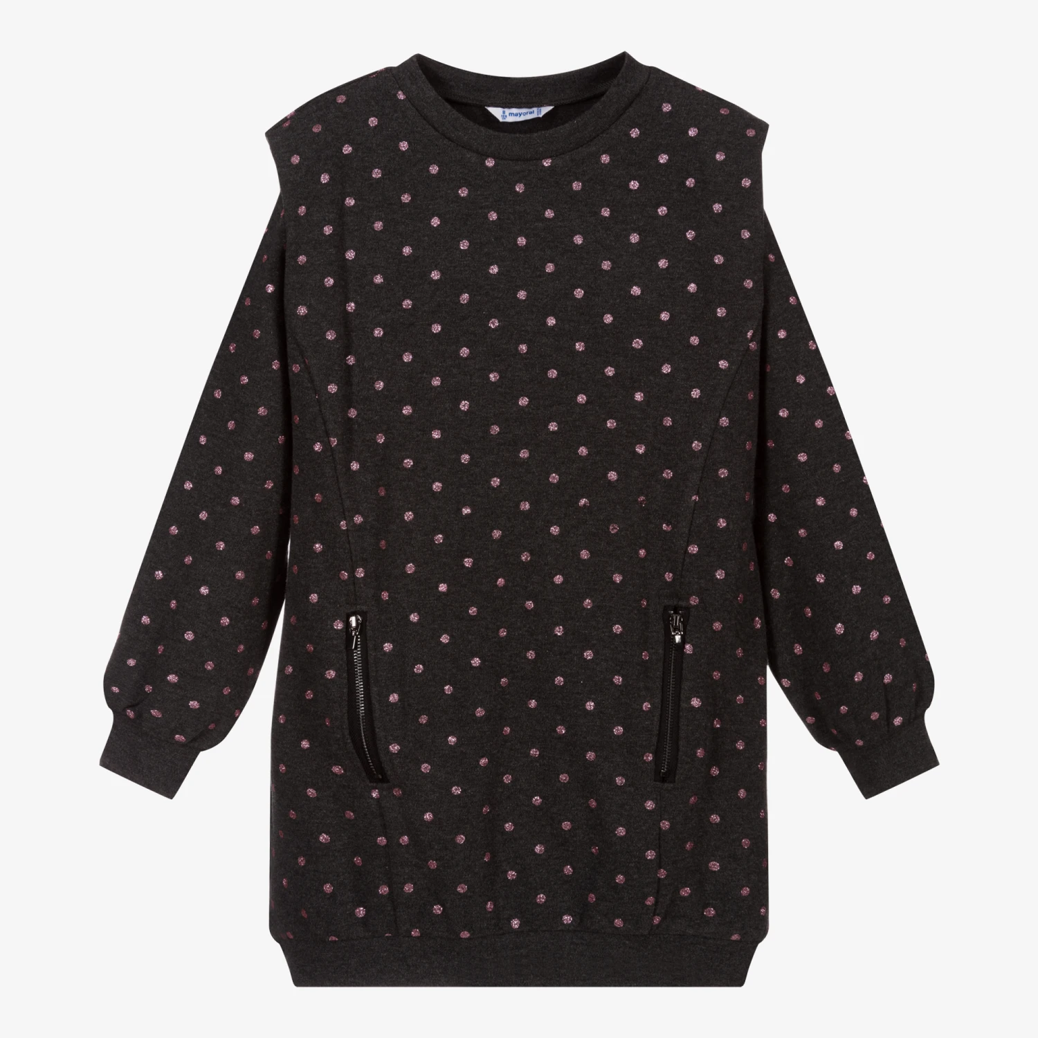 Grey sweatshirt dress for girls by Mayoral, patterned with glittery pink polka dots. Made in a lightweight polycotton blend, it has zipped pockets on the front.