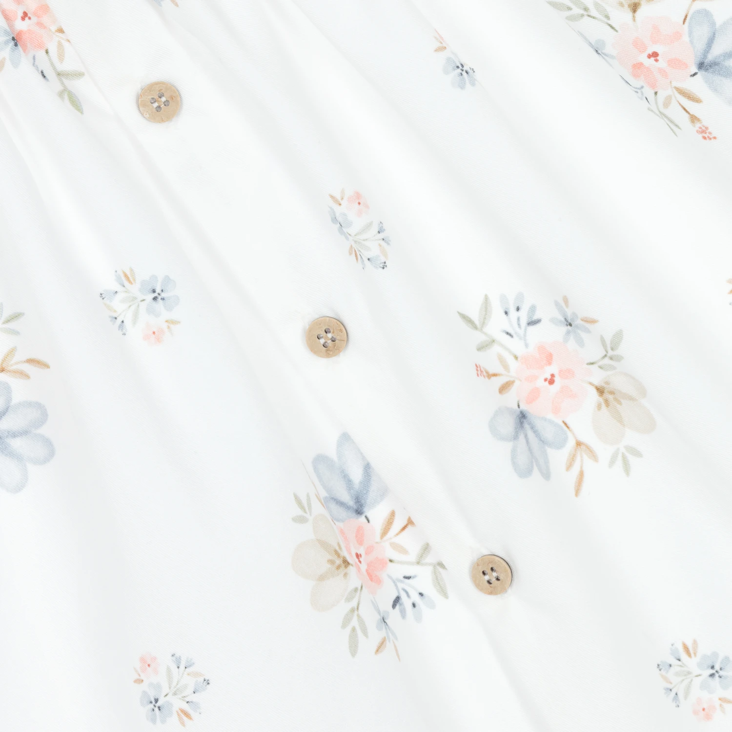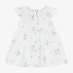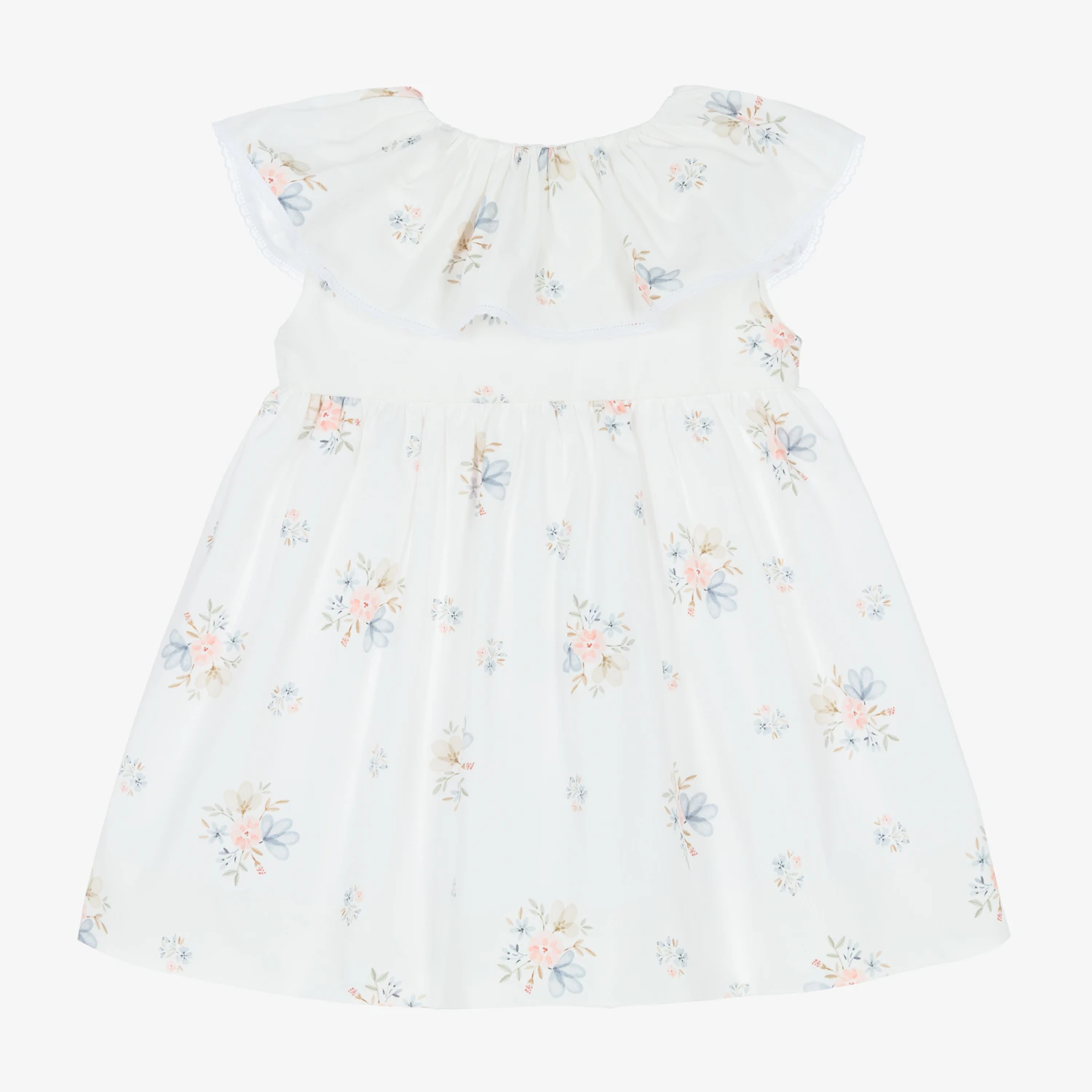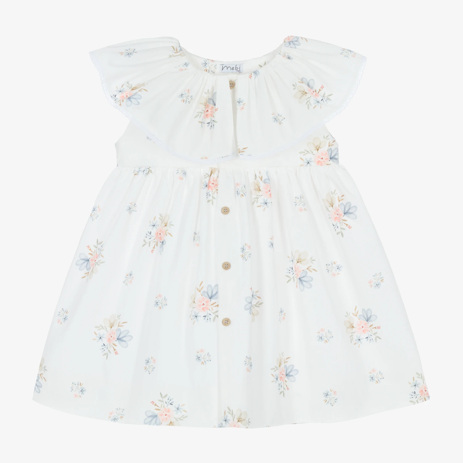 A white dress for little girls by Spanish brand Mebi, made in the softest cotton poplin. Fully lined, this classical dress has a floral design, with button fastenings down the front. The ruffled collar is trimmed with scalloped embroidery for an elegant finishing touch.