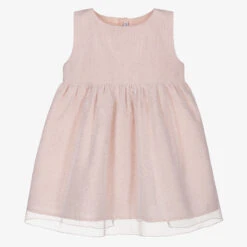 Gorgeous pink special occasion dress for girls by Mebi. Made in a lightweight cotton and linen blend, it has a white tulle overlay shimmering with silver glitter. A sash ties in a bow on the front and back and pretty mother-of-pearl buttons fasten around the back. Mebi is a small fitting brand, please choose a size up to allow room to grow.