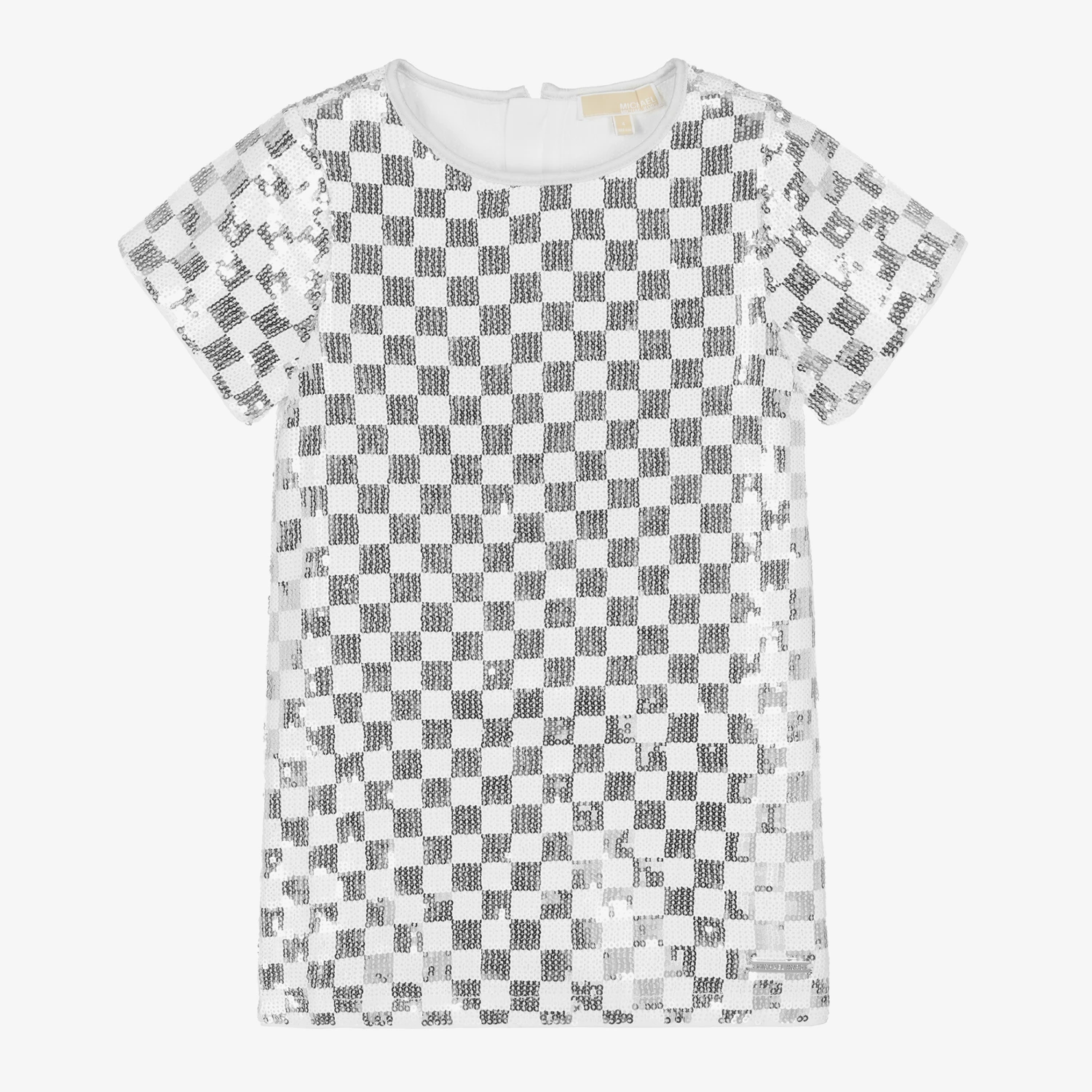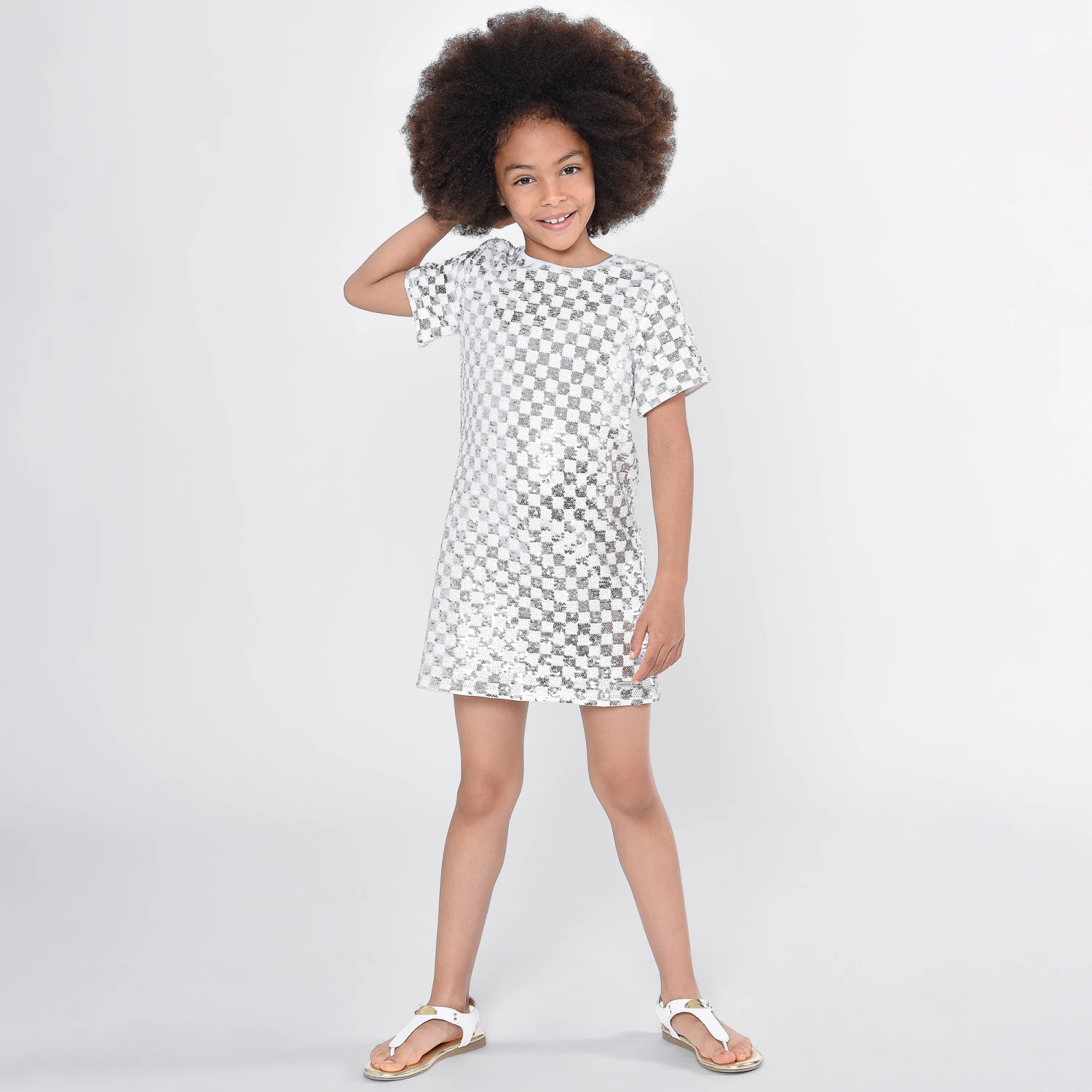 Stunning white and silver checked sequin dress for girls by American brand Michael Kors. A simple and elegant shift style, it is comfortably lined in soft viscose and fastens with a zip on the back. The brand’s silver metal logo plate can be found on the front hem, for a designer finish.
