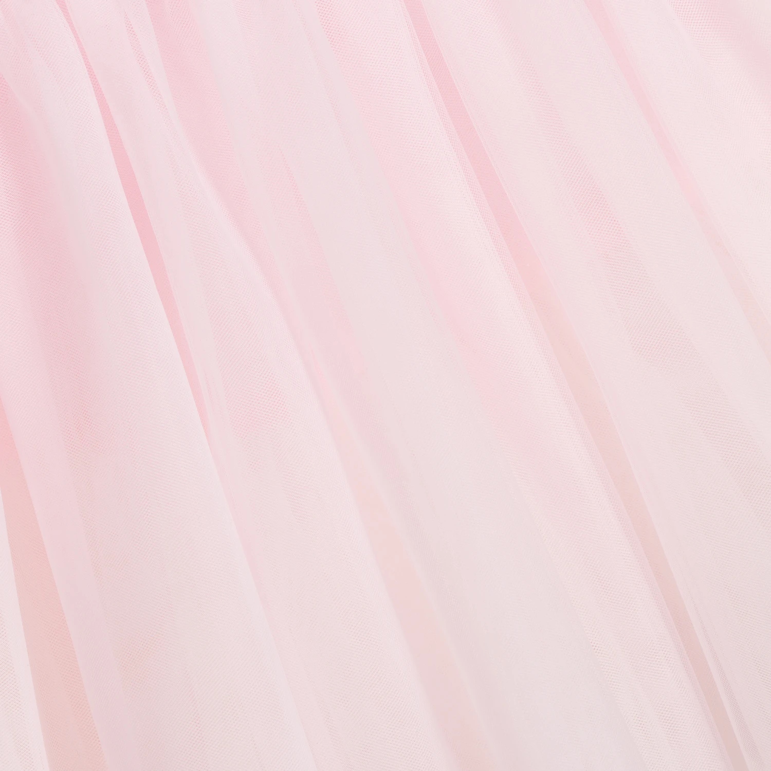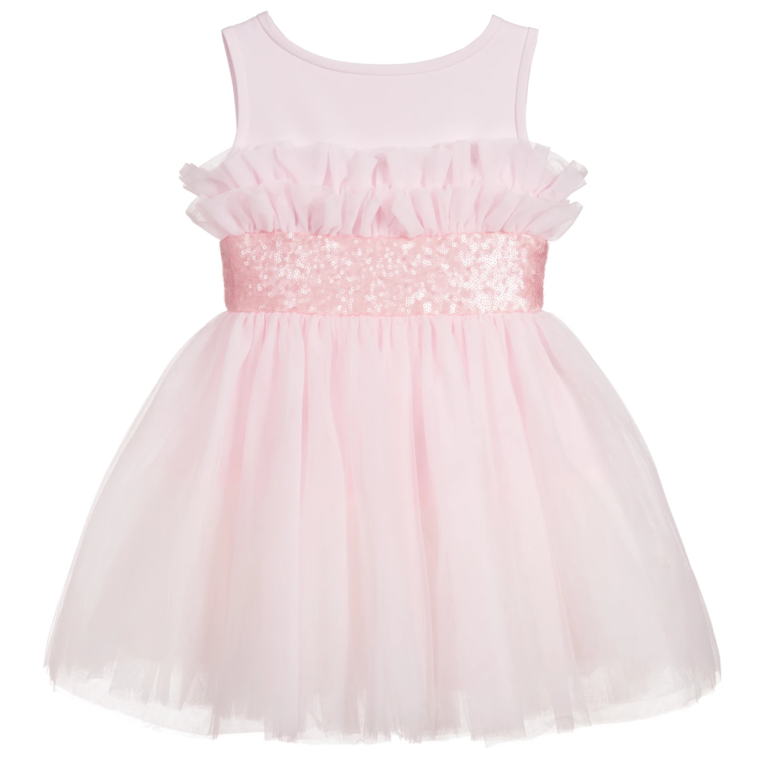 Pretty pink dress for girls by Monnalisa Chic. The bodice is made in soft, mid-weight viscose, whilst the lightweight tulle skirt has frills above the shimmering, sequinned waistband. The pink cotton lining has ivory tulle frills for extra volume.