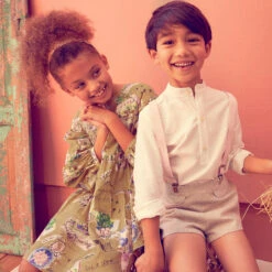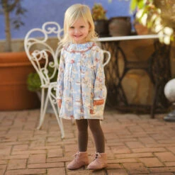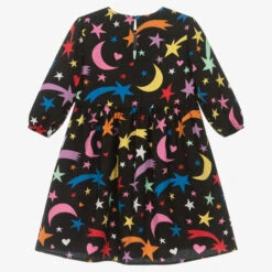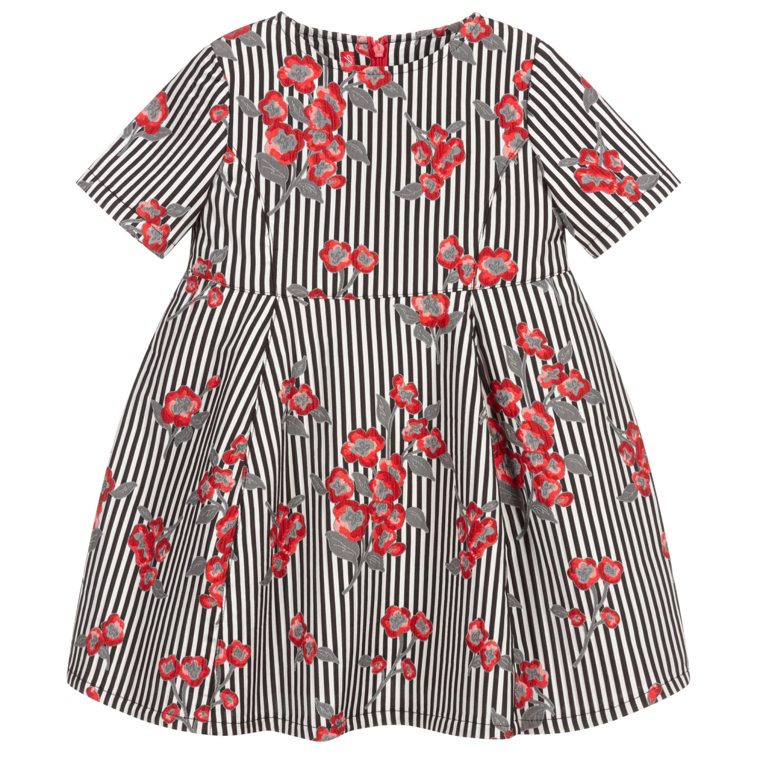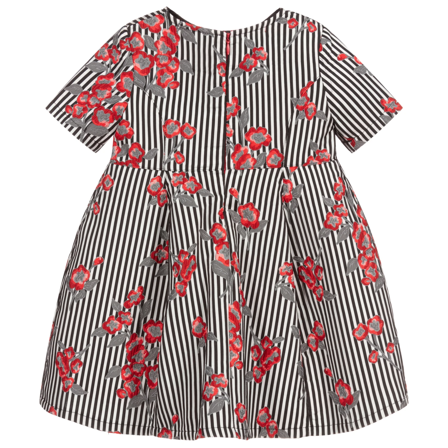 Black and white striped dress for girls by Pan Con Chocolate, made in mid-weight polyester, with a ribbed feel. Fully lined in silky polyester, it has a red and grey floral jacquard pattern and a concealed zip on the back.