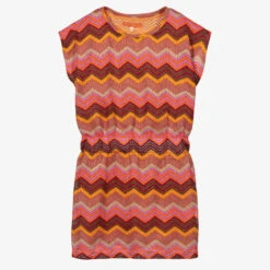 A gorgeous and eye-catching zigzag knit dress for girls by Pan Con Chocolate, in shades of orange, pink and brown. Simple and stylish with an elasticated waist, this easy-to-wear style has an orange chiffon lining for modesty and comfort.