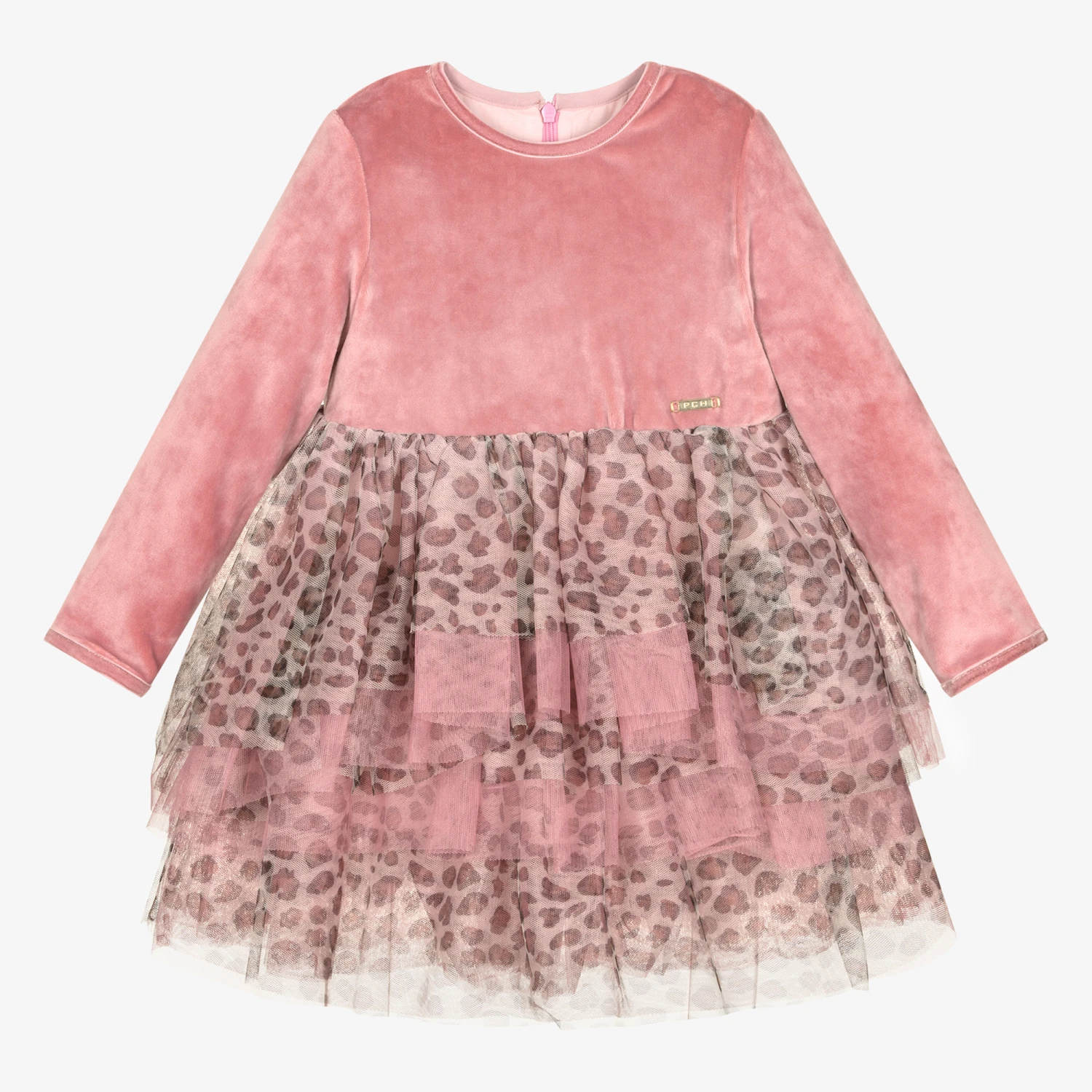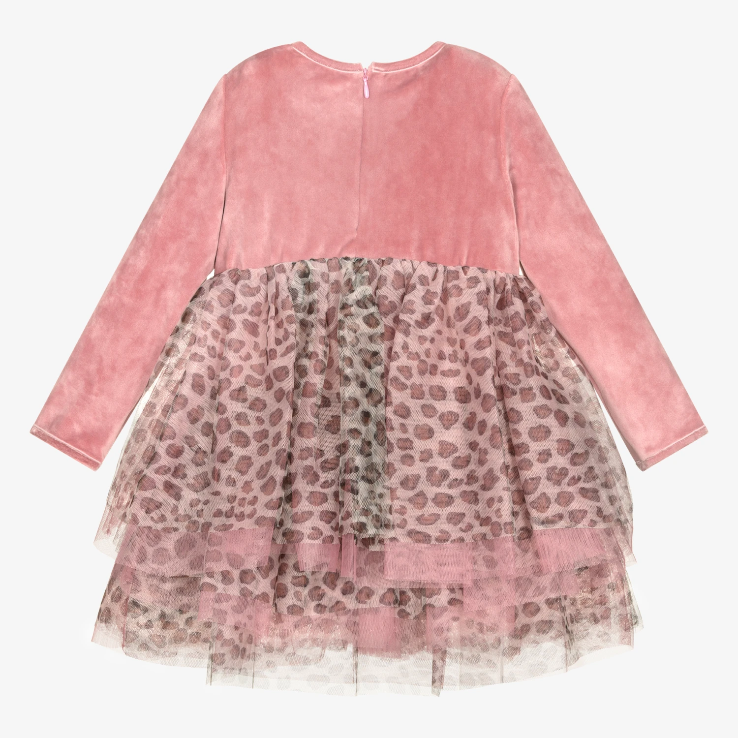 Gorgeous pink dress for girls by Pan Con Chocolate, made in super soft velour. It has a pretty tulle skirt, tiered for volume and patterned in a chic leopard print. Lined in lightweight cotton, it fastens with a concealed zip on the back and has a shiny gold logo tab on the front.