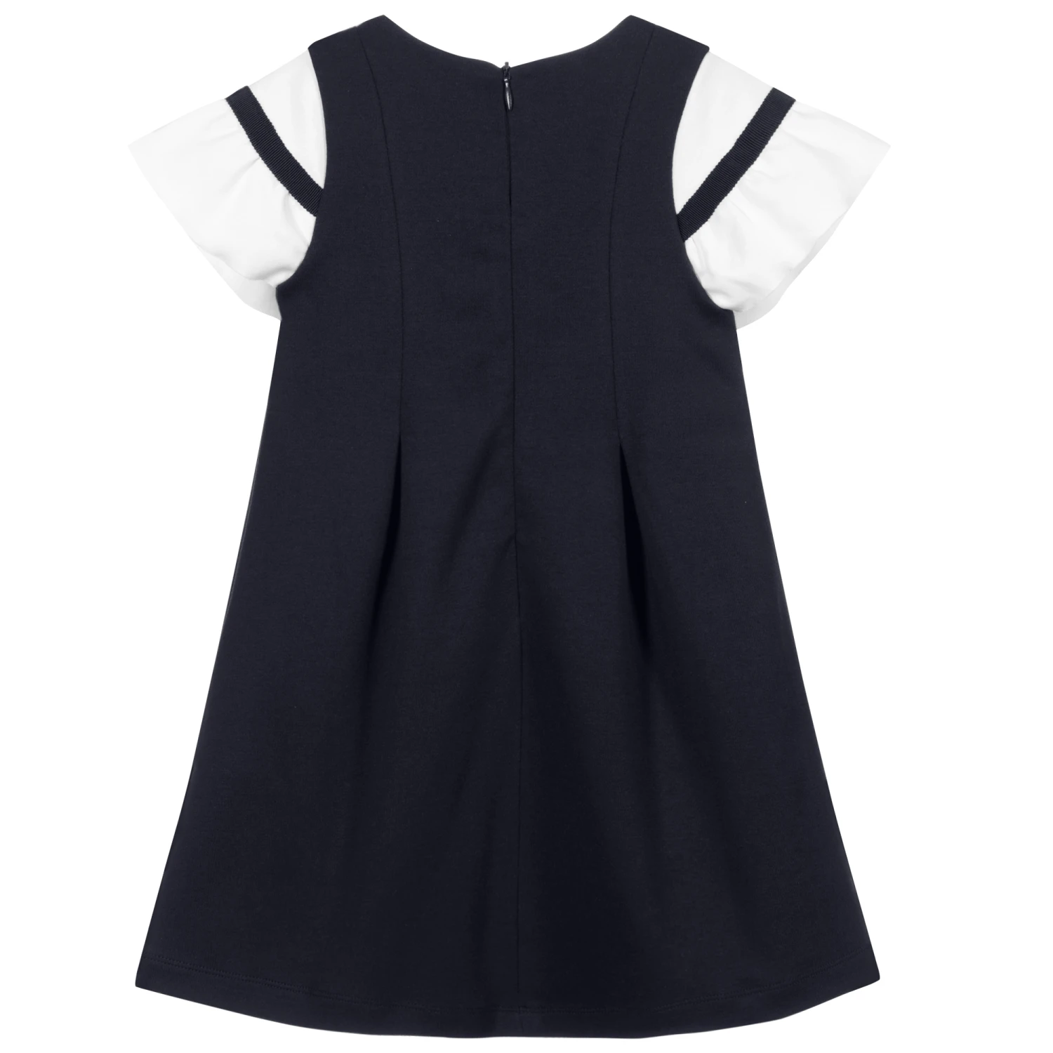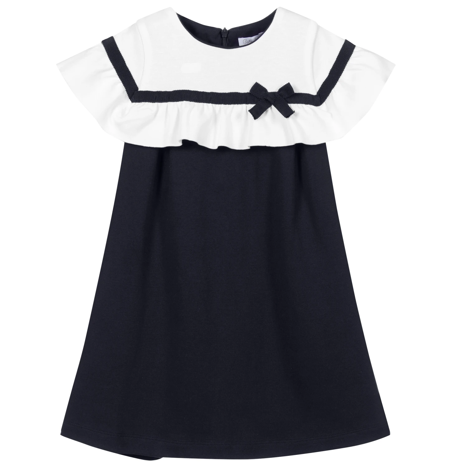 Girls navy blue and white dress by Patachou, made in soft and stretchy cotton jersey. It has a grosgrain ribbon trim around the shoulders, and it fastens with a zip on the back.