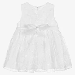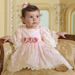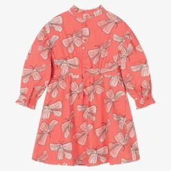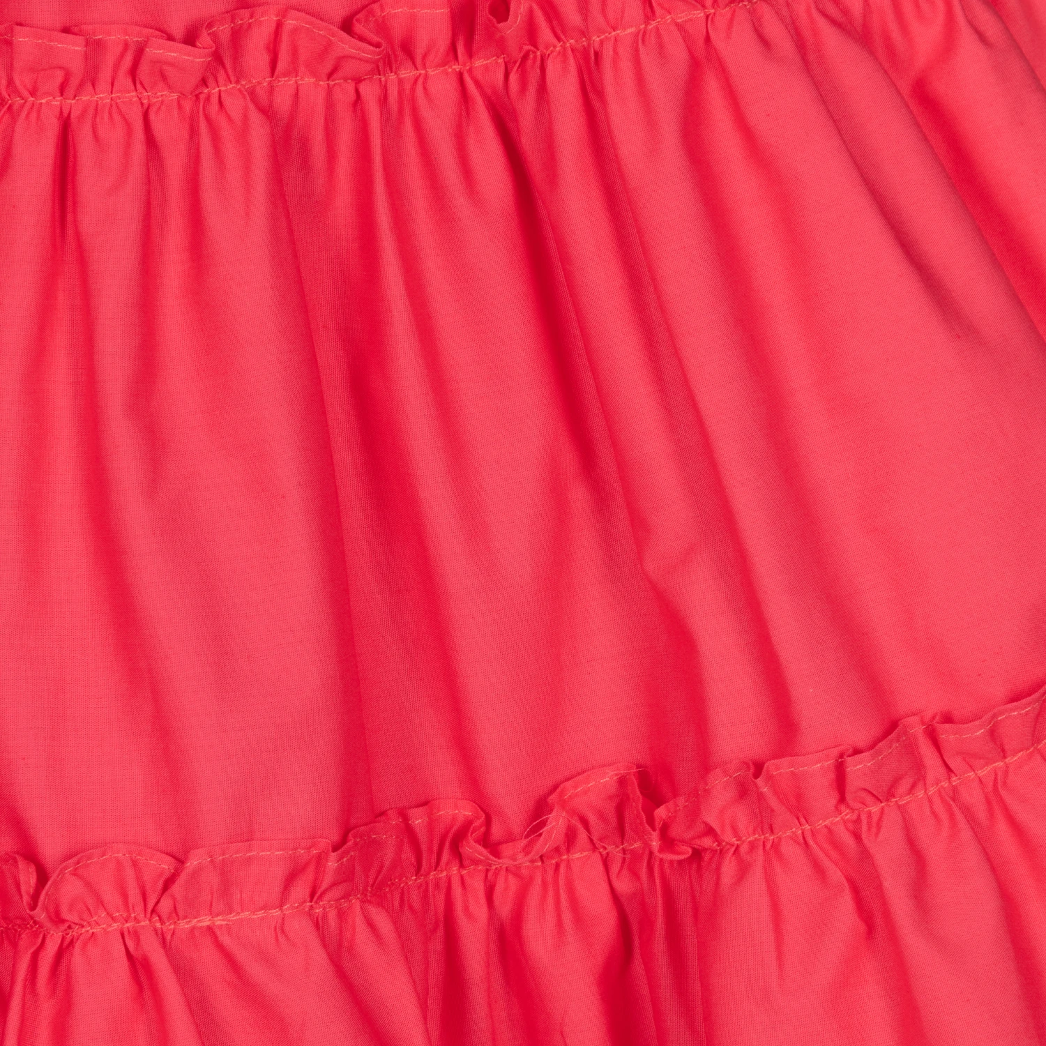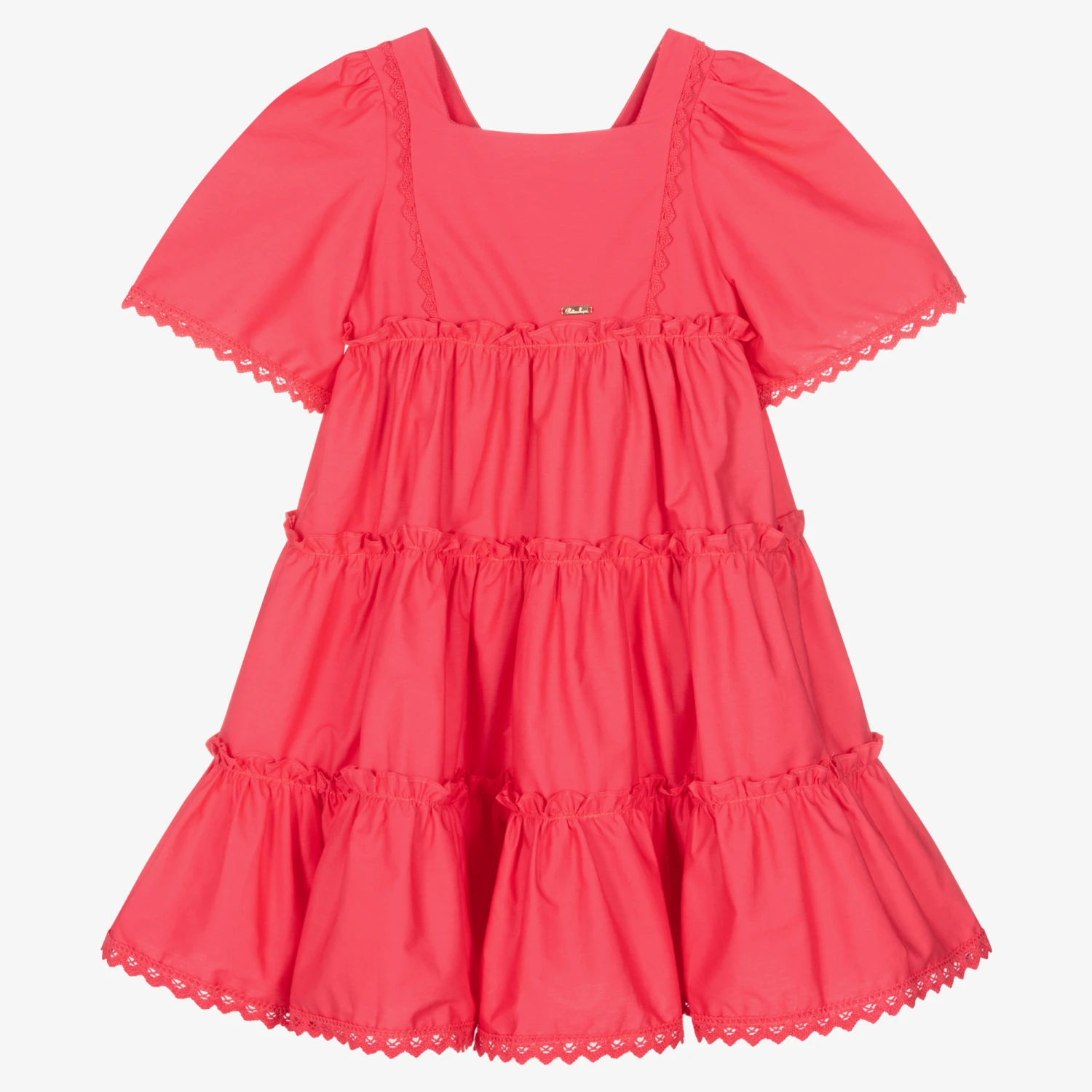 Pretty fuchsia pink dress for girls by classic Portuguese brand Patachou, with frilled tiers and embroidered, scalloped trims. Made in lightweight cotton poplin, it has large, puffed sleeves, a full voile lining for comfort and a neat, concealed zip fastening on the back. The rose gold metal logo tab on the bodice lends a signature touch.