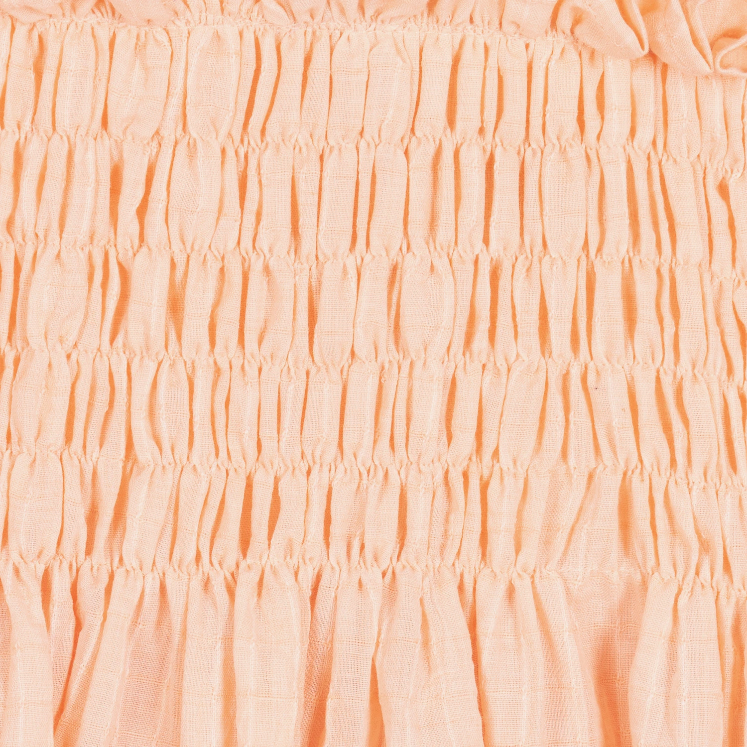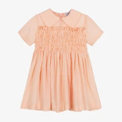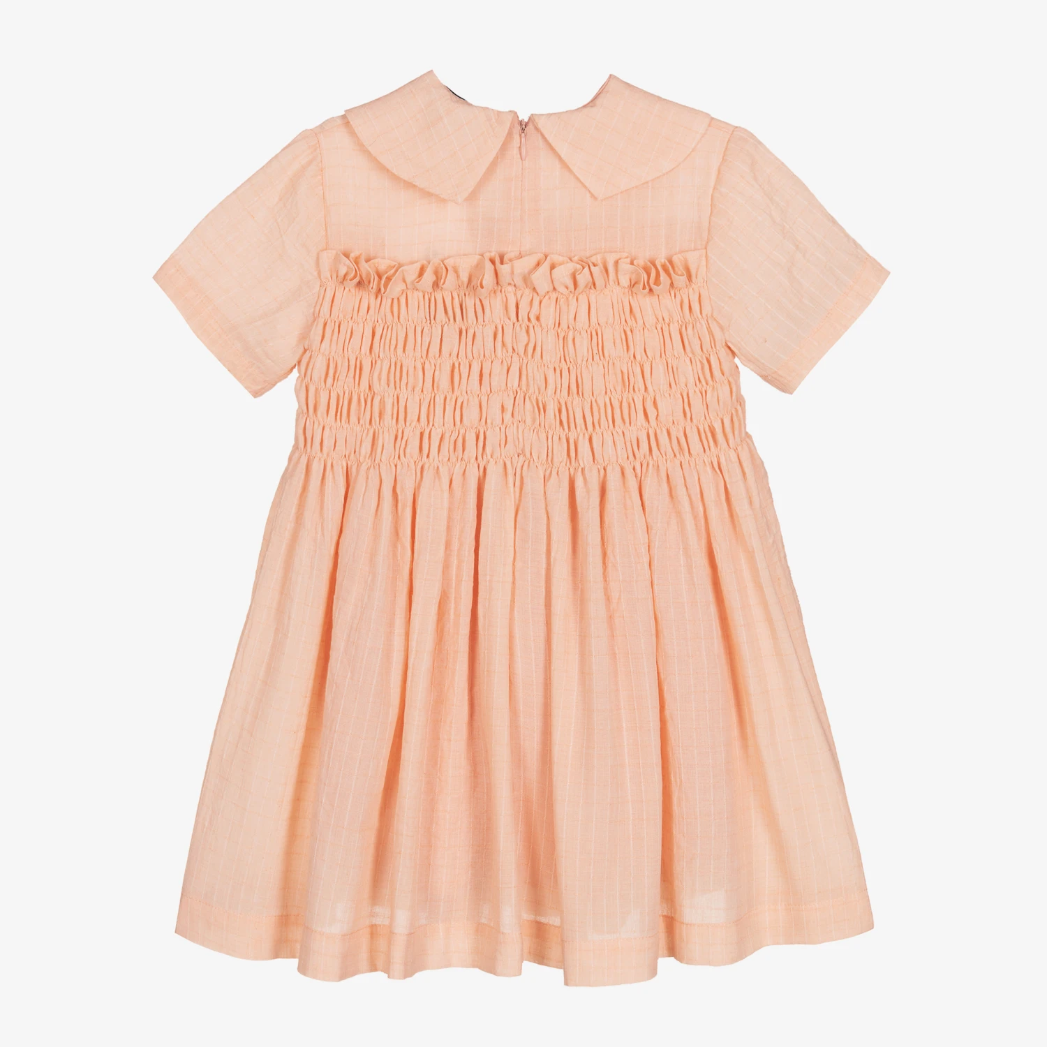 Pastel orange dress for girls by London-based designer, RaspberryPlum. Soft and lightweight, the cotton blend fabric has a delicate grid pattern, with a ruched bodice and oversized collar. There is a concealed back zip fastening and a silky viscose lining.