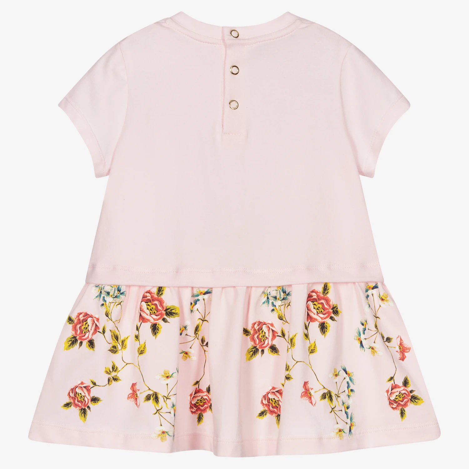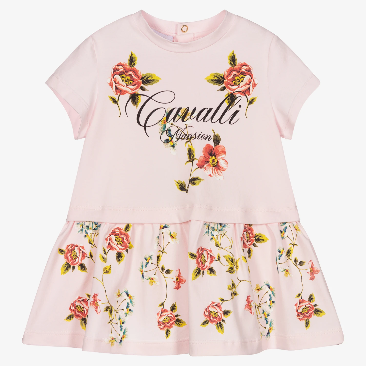 Little girls pink dress from luxury Italian brand Roberto Cavalli, made in soft cotton jersey. It has a colourful floral pattern on the skirt and a matching floral and logo print on the chest. There are popper fastenings on the back and pretty capped sleeves.