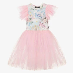 Gorgeous blue and pink party dress for girls, by Rock Your Baby. Made in soft cotton jersey, it has a whimsical princess, castle and dragons print bodice with dramatic pink flutter sleeves with a gold shimmer. Creating a silhouette made for a princess, it has a voluminous pink tulle skirt with gold shimmer polka dots for added sparkle.