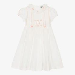 Lovely ivory dress for little girls by classic British brand Sarah Louise, made in a lightweight cotton blend. Traditionally styled, it has hand smocking and coral pink hand-embroidered flowers across the bodice with little pintucks. The hand-smocked collar and pretty puffed sleeves both have matching floral embroidery. It is fully lined in voile for comfort and has pearlescent button fastenings around the back, with a sash that ties in a bow on larger sizes.