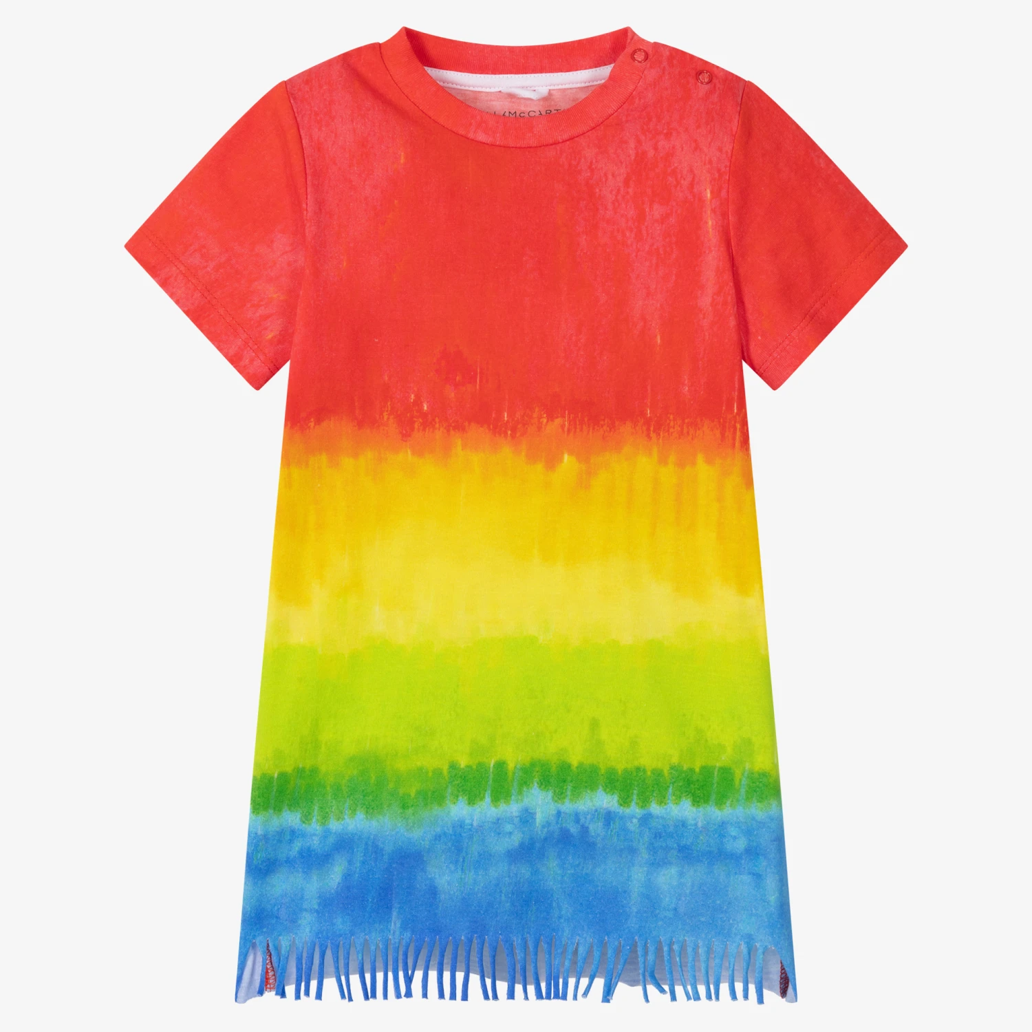 In a colourful tie-dye design, this fun T-shirt dress for little girls is by Stella McCartney Kids. Made in soft organic cotton jersey, it has fun fringing detail on the raw edged hem. There are popper fastenings on one shoulder to assist with dressing.