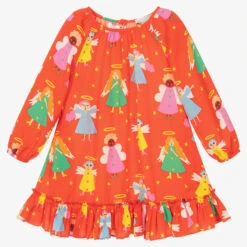 Bright red dress for girls by Stella McCartney Kids, made in lightweight Tencel™ twill. Fastening with buttons on the back, it has a colourful all-over festive angel print. There are concealed side pockets and a skirted ruffle hem, for a feminine flourish.