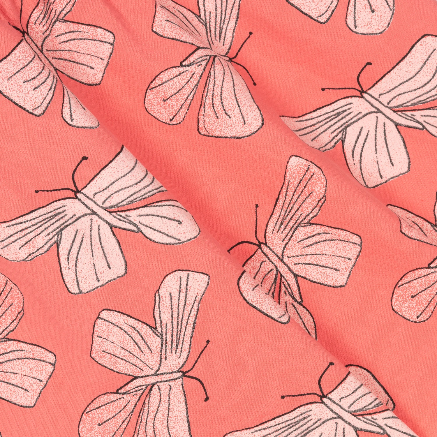 Pink dress for girls by The Animals Observatory with a vibrant pink butterfly print, made in a mid-weight blend of cotton and linen. This fun dress has a ruffled high neck collar, frilly cuffed sleeves and a yellow embroidered logo on the bodice. It has pink pearlescent button fastenings on the back.
