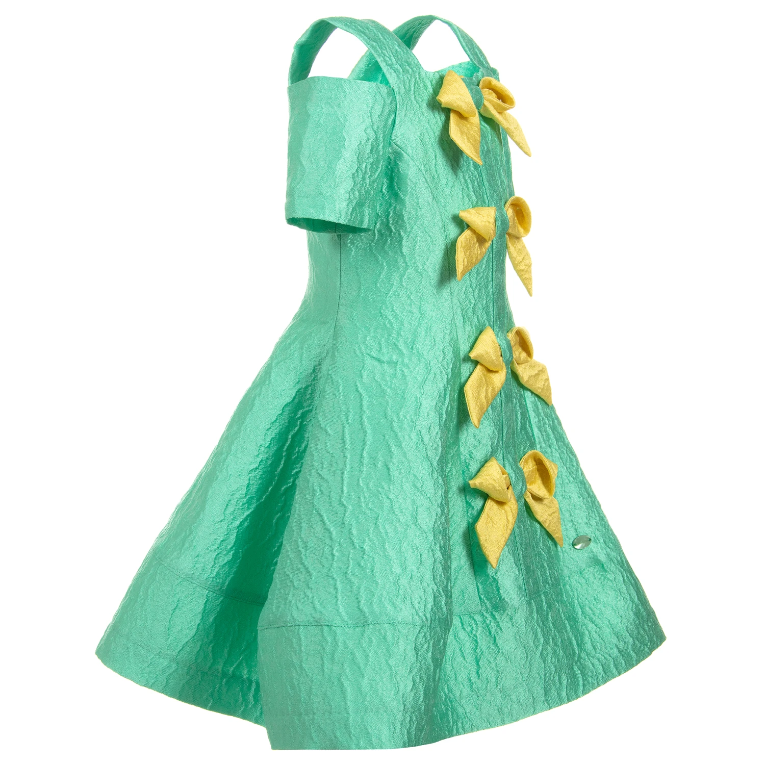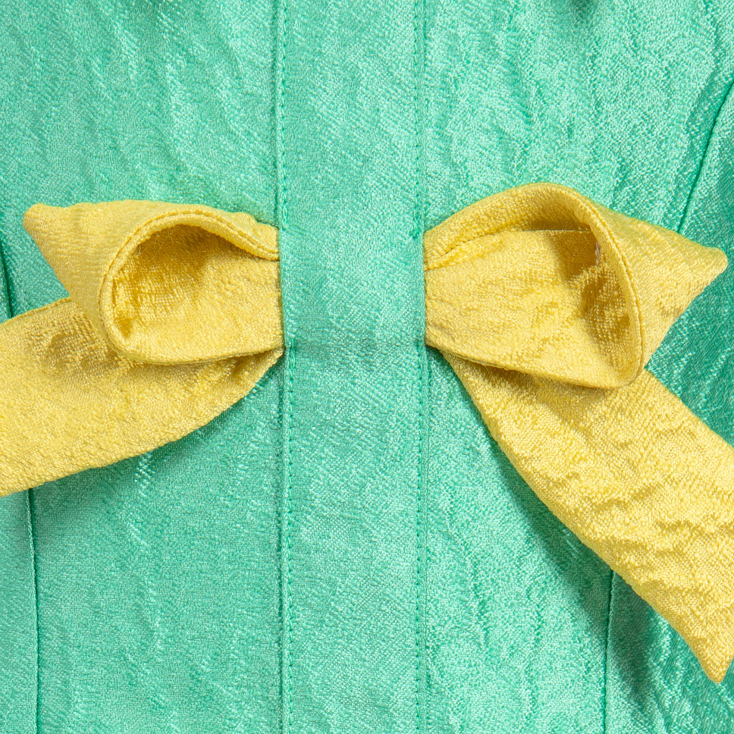 A striking, bright green dress by Valmax, with yellow bows down the front. Made in a lightweight, silk-blend, the dress has a fitted bodice and a full, flared skirt, which has a cotton lining stiffened on the hem for extra volume.