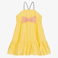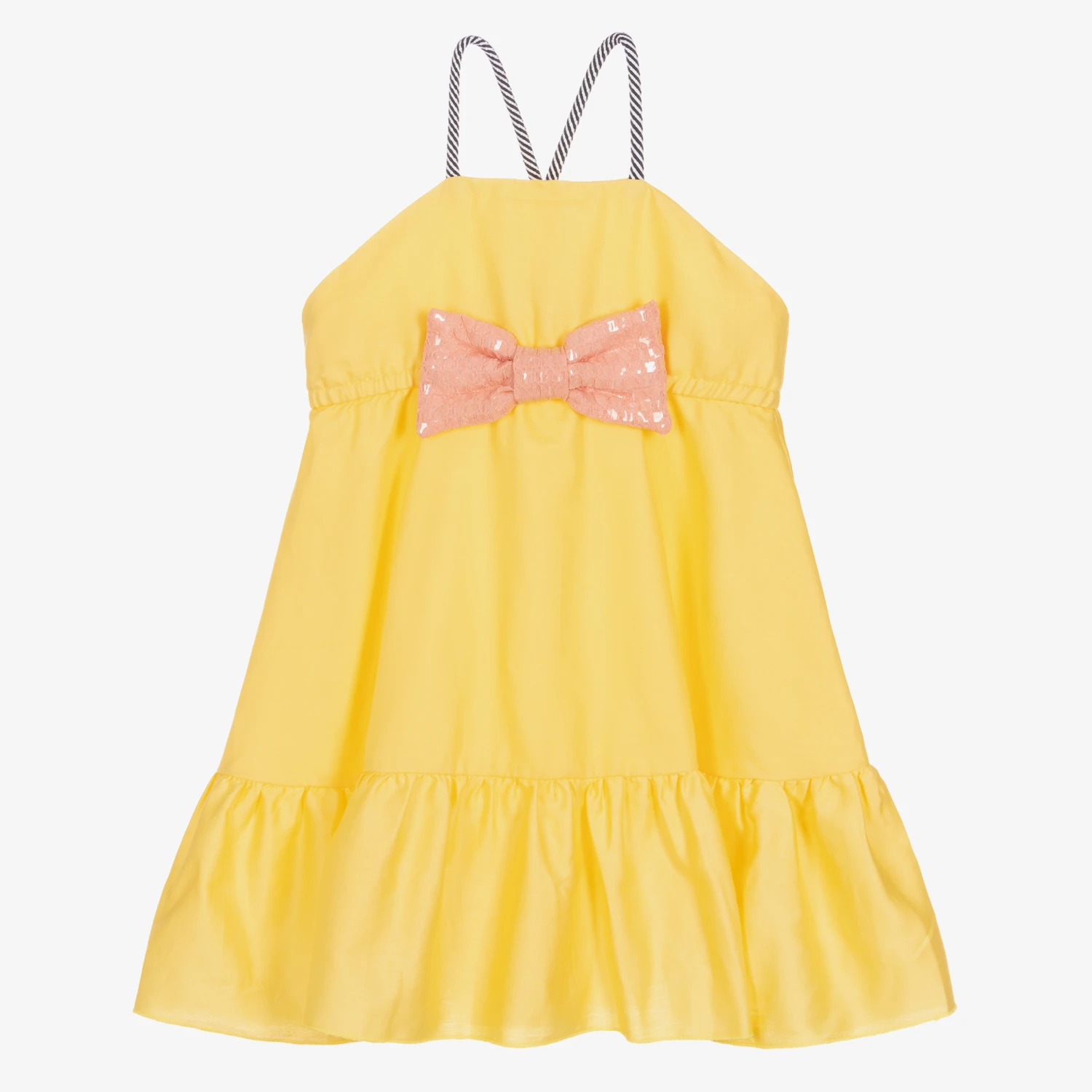 Lovely vibrant yellow dress for girls from Wauw Capow by Bangbang, made in comfortable, lightweight cotton. Ideal for those warmer days, it has black striped shoulder straps and a shimmrering coral pink bow on the front. Lightly elasticated on the bodice, this casual dress pops on easily over the head.